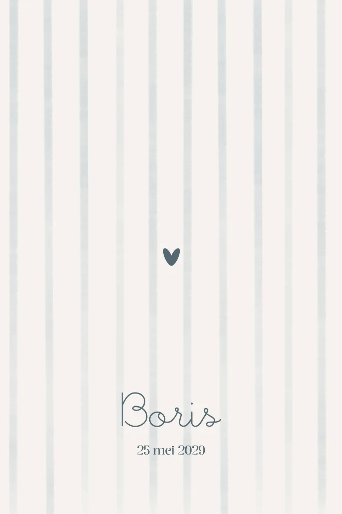 Strak geboortekaartje voor een jongen met zachte blauwe strepen en een klein hartje. Een modern en tijdloos ontwerp in rustige tinten. De naam, tekst en kleuren zijn volledig aanpasbaar in de editor. Wil je dit ontwerp liever in een ander formaat of op een bijpassend product? Stuur me gerust een berichtje, dan zet ik het gratis voor je klaar.