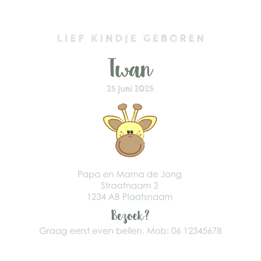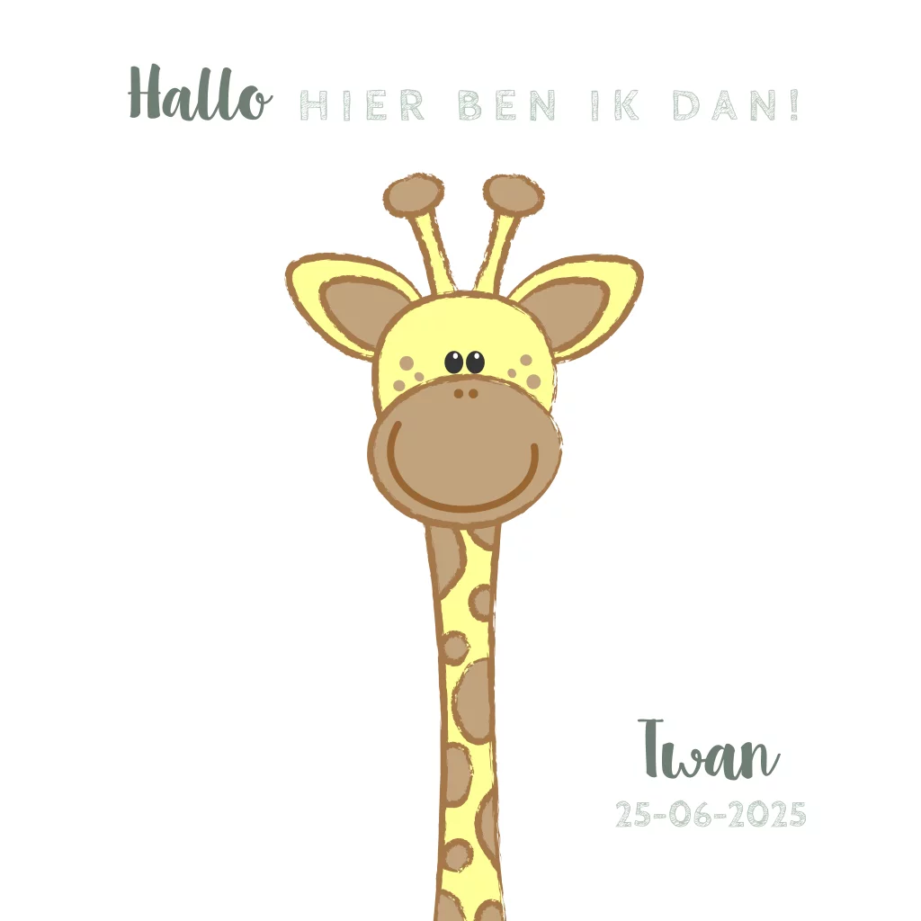 Geboortekaartje voor een jongen met een illustratie van een lief girafje. Deze kaart kan geheel naar wens worden aangepast.