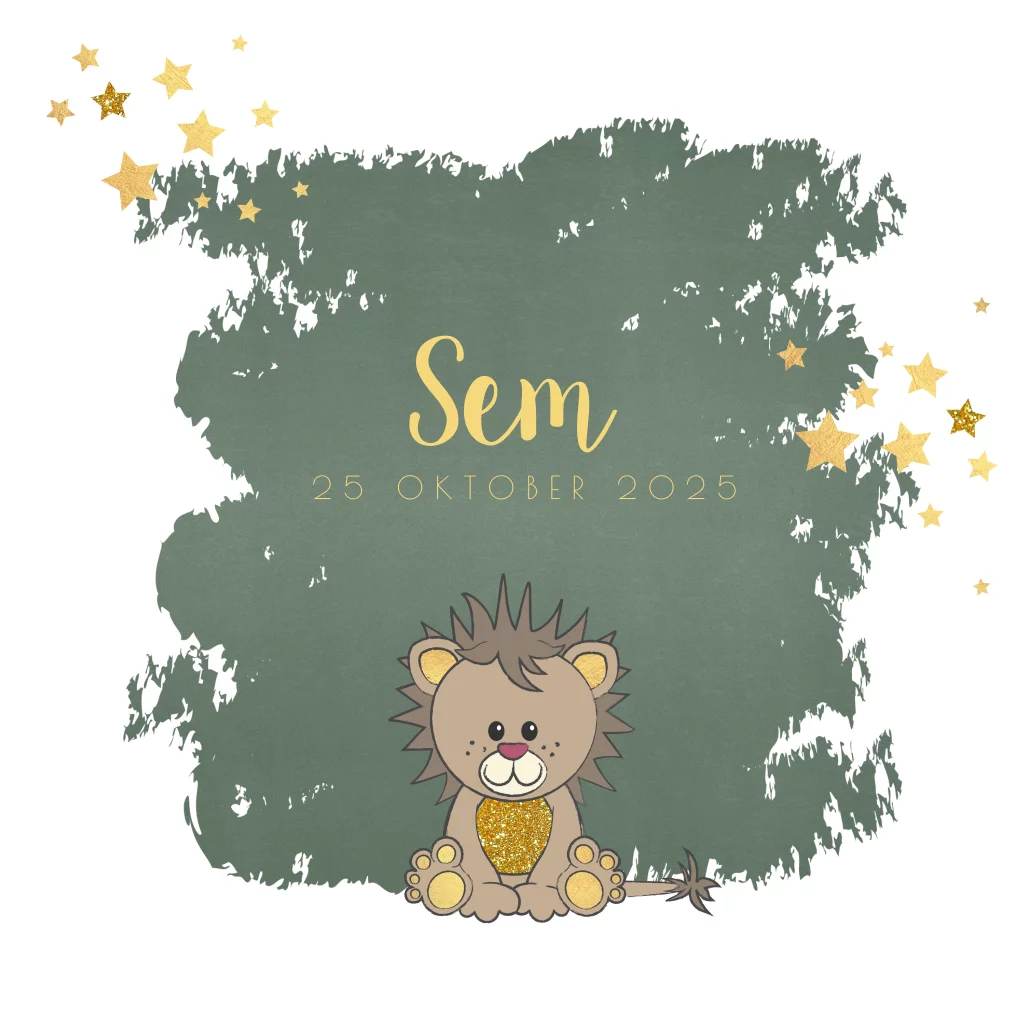 Hip groen geboortekaartje met een schattige leeuw en sterren Sem