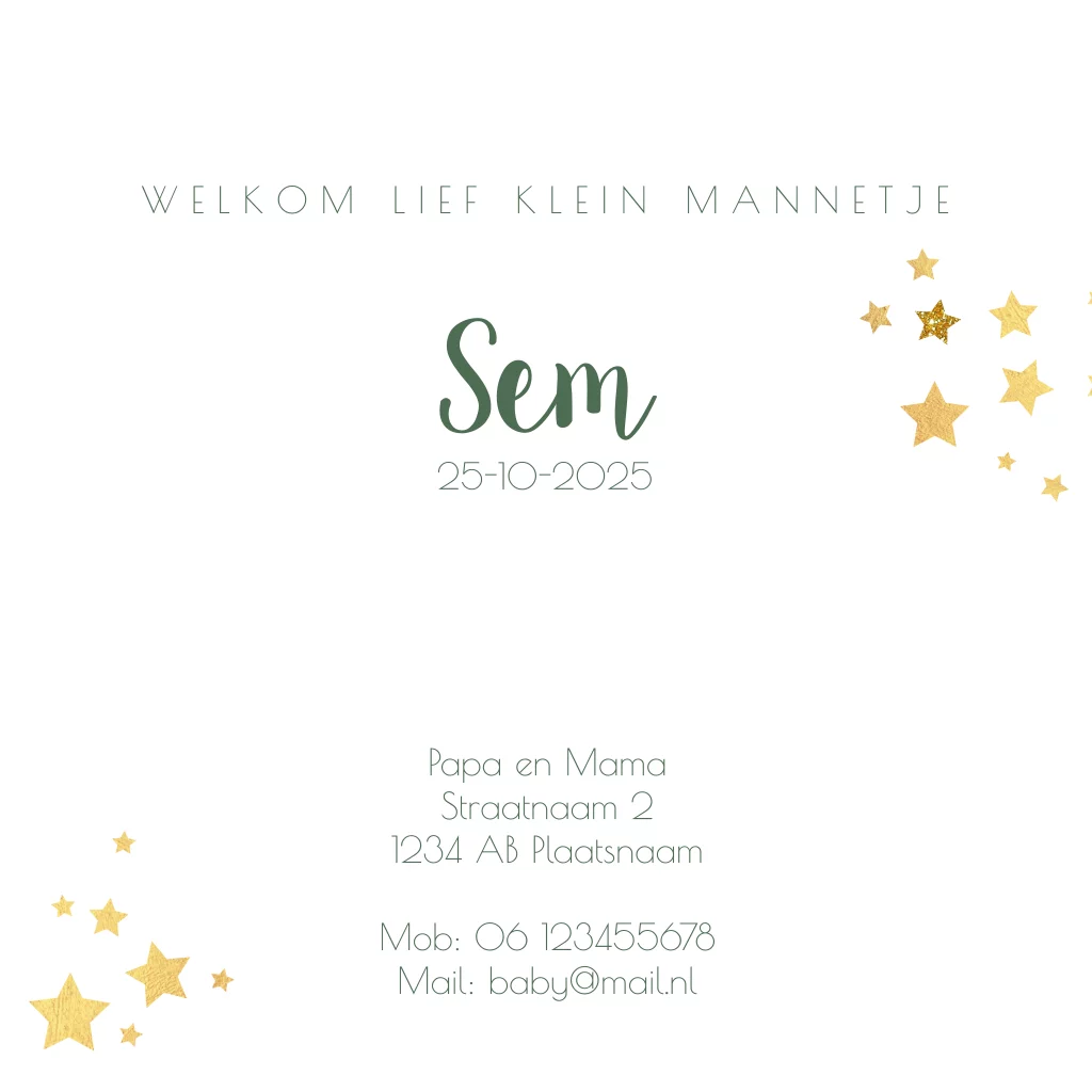 Lief en stoer groen geboortekaartje voor een jongen met goudkleurige sterren een illustratie van een schattige leeuw.