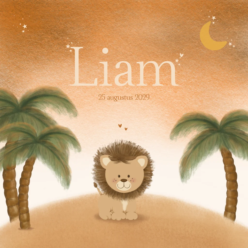 Geboortekaartje jongen met leeuwtje en palmbomen - Liam