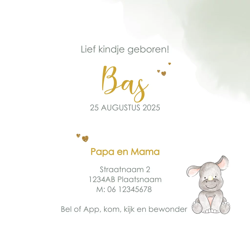Zo lief, dit geboortekaartje voor een jongen. De achtergrond heeft een witte kleur met groene gekleurde waterverf. De tekening van deze schattige baby neushoorn heeft een lieve look. Pas dit schattige geboortekaartje naar wens aan en bestel eerst een proefdruk om te zien hoe het kaartje voor jullie kindje er in het echt uitkomt te zien.