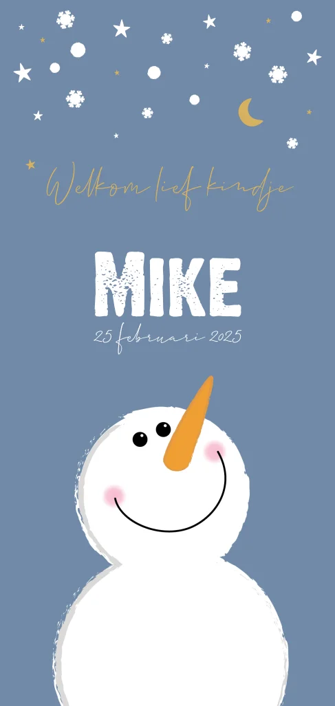 Winters geboortekaartje voor een jongen met een lieve sneeuwpop, sneeuwvlokken, en sterren. Verwachten jullie een zoon in de winter? Dan is dit lieve geboortekaartje misschien wel wat voor jullie kindje! Deze geboortekaart kun je naar wens aanpassen, en zo maak je zelf jullie unieke geboortekaart voor jullie baby.