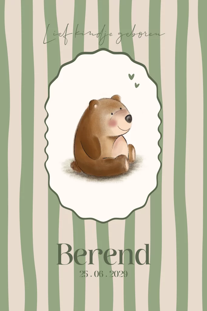 Laat iedereen weten dat jullie kleintje is geboren met dit lieve geboortekaartje! De zachte strepen in saliegroen en warm beige geven het kaartje een speelse en toch rustige uitstraling. Boven het midden prijkt een sierlijke, kronkelige ovaal met een subtiel groen randje, als een elegant lijstje voor de schattige illustratie van een zittend beertje met twee hartjes. De afgeronde hoeken zorgen voor een zachte, vriendelijke touch.