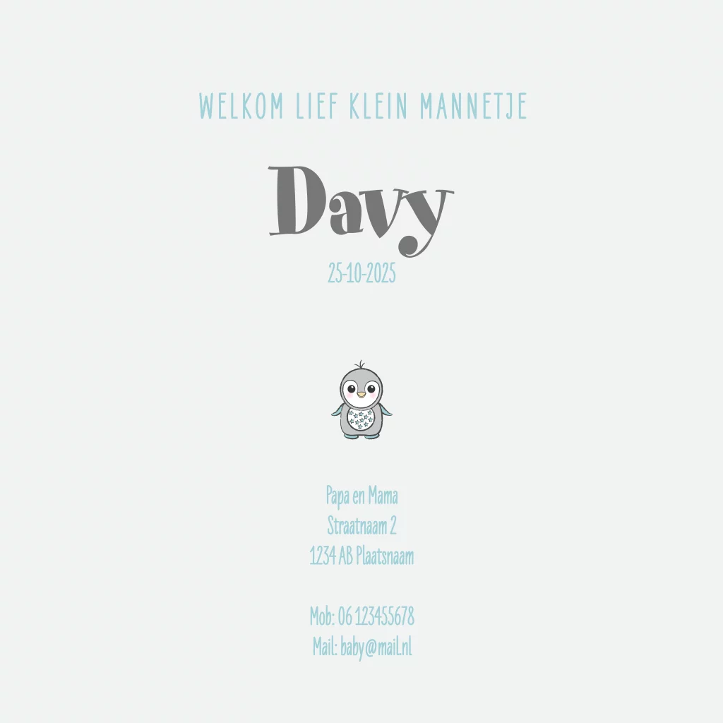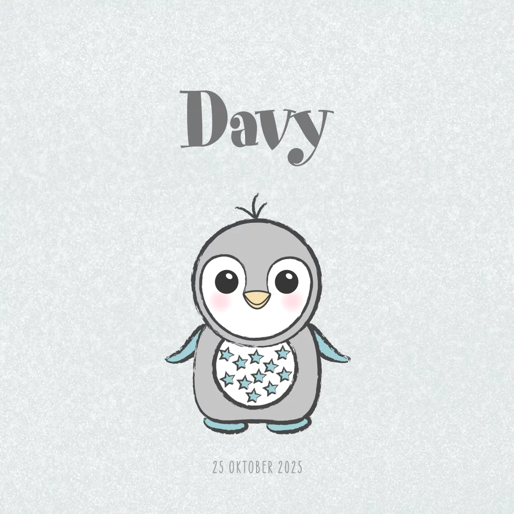 Schattig geboortekaartje voor een jongen met een illustratie van een lieve pinguin. De achtergrond van deze geboortekaart heet een licht blauwe achtergrond met een sneeuw structuur. Pas het kaartje geheel naar wens aan en bestel een proefdruk om het kaartje in het echt te kunnen bewonderen.