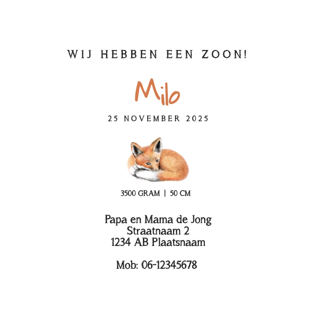 Geboortekaartje met een potloodtekening van een lief baby vosje dat opgerold ligt. Je kunt deze kaart eenvoudig aanpassen.