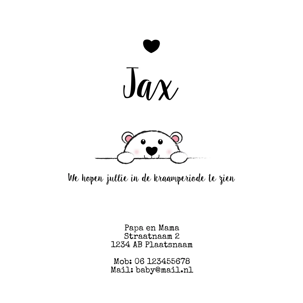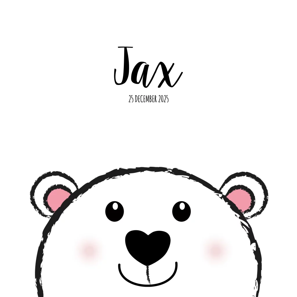 Geboortekaartje zwart-wit met een lief stoer ijsbeertje Jax