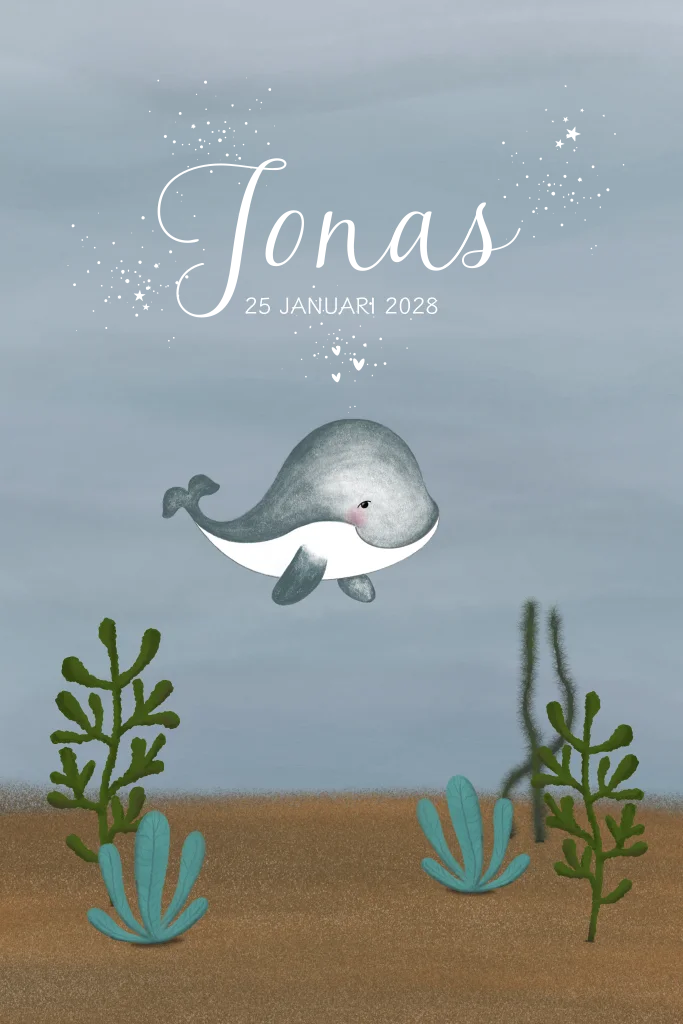 Dit geboortekaartje met een lief walvisje heeft een magische en speelse uitstraling. De walvis zwemt vrolijk tussen het zeewier in een zachte blauwe zee. Kleine gouden sterretjes en hartjes laten de naam in goudfolie extra stralen.