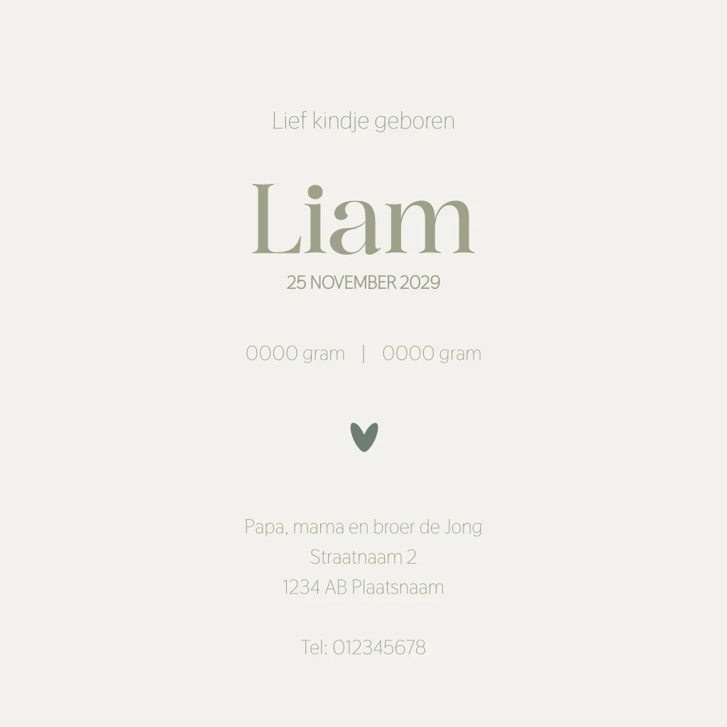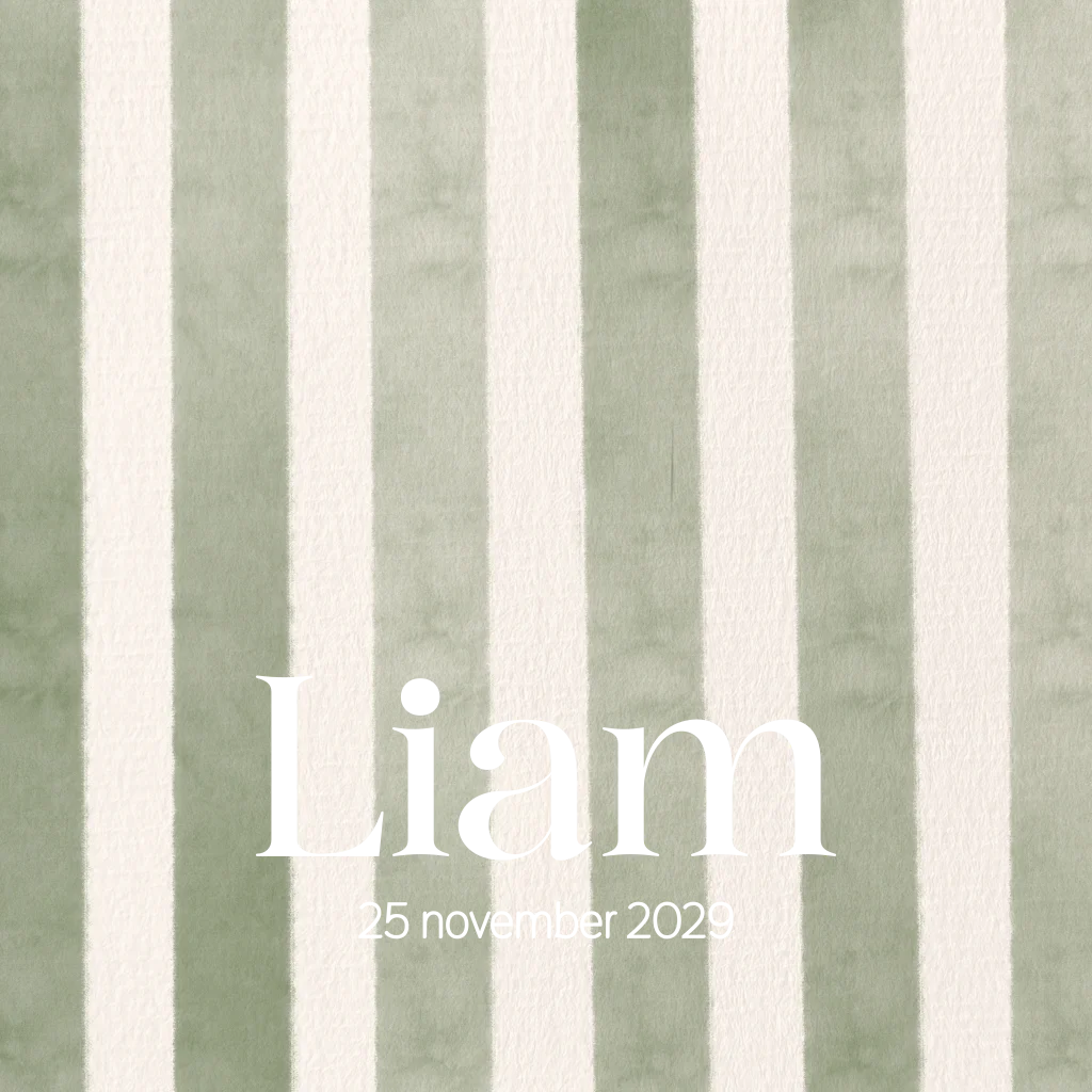 Een stijlvol en tijdloos geboortekaartje met een minimalistisch design. De zachte crèmekleurige achtergrond wordt speels verrijkt met olijfgroene waterverfstrepen, wat het kaartje een natuurlijke en verfijnde uitstraling geeft. De subtiele geschilderde papierstructuur-look voegt een ambachtelijke touch toe, waardoor het ontwerp warmte en karakter uitstraalt.