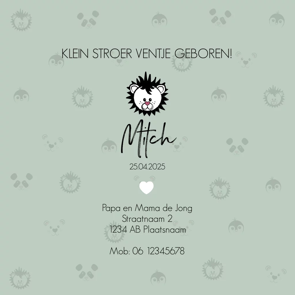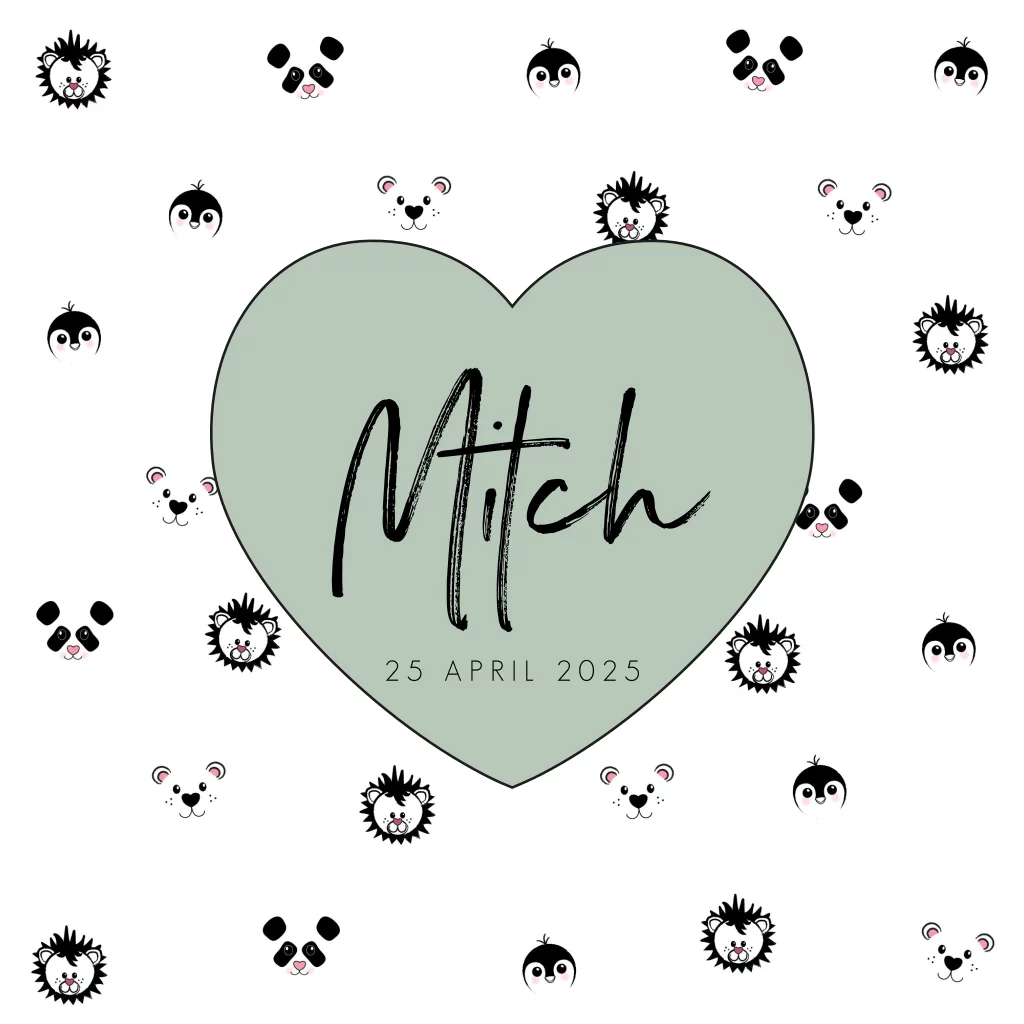 Stoere, hippe geboortekaart met dierenpatroon, een olijf groen hart en folie-bedrukking. De geboortekaart heeft een zwart-wit dierenpatroon met illustraties van een leeuw, pinguïn, panda en een beer. De kleur van het hart kun je aanpassen.
