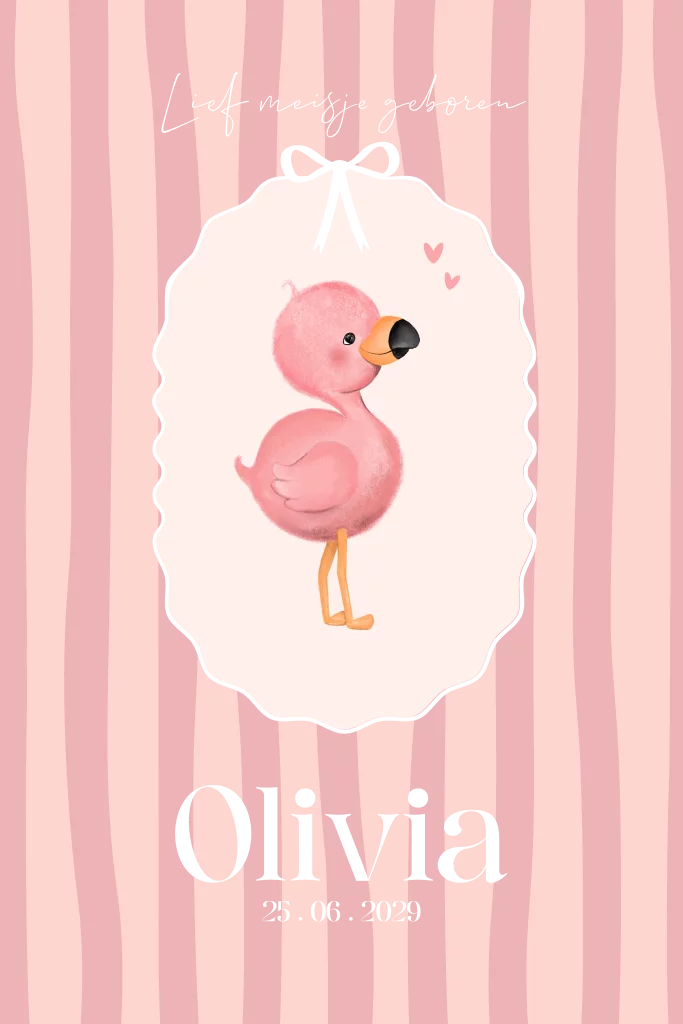 Laat iedereen weten dat jullie dochter geboren is met dit chique en speelse geboortekaartje! De strepen in zacht koraalroze geven het kaartje een warme en liefdevolle uitstraling. In het midden prijkt een sierlijk ovaal met een verfijnde kronkellijn in luxe goudfolie, met daarboven een elegant gedrukt strikje. Binnen het ovaal staat een schattige illustratie van een lieve flamingo, perfect passend bij de zachte en stijlvolle sfeer.