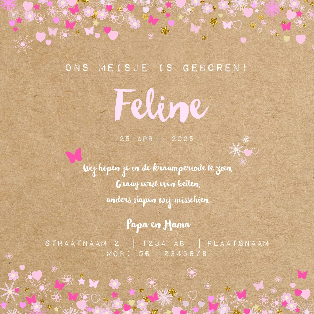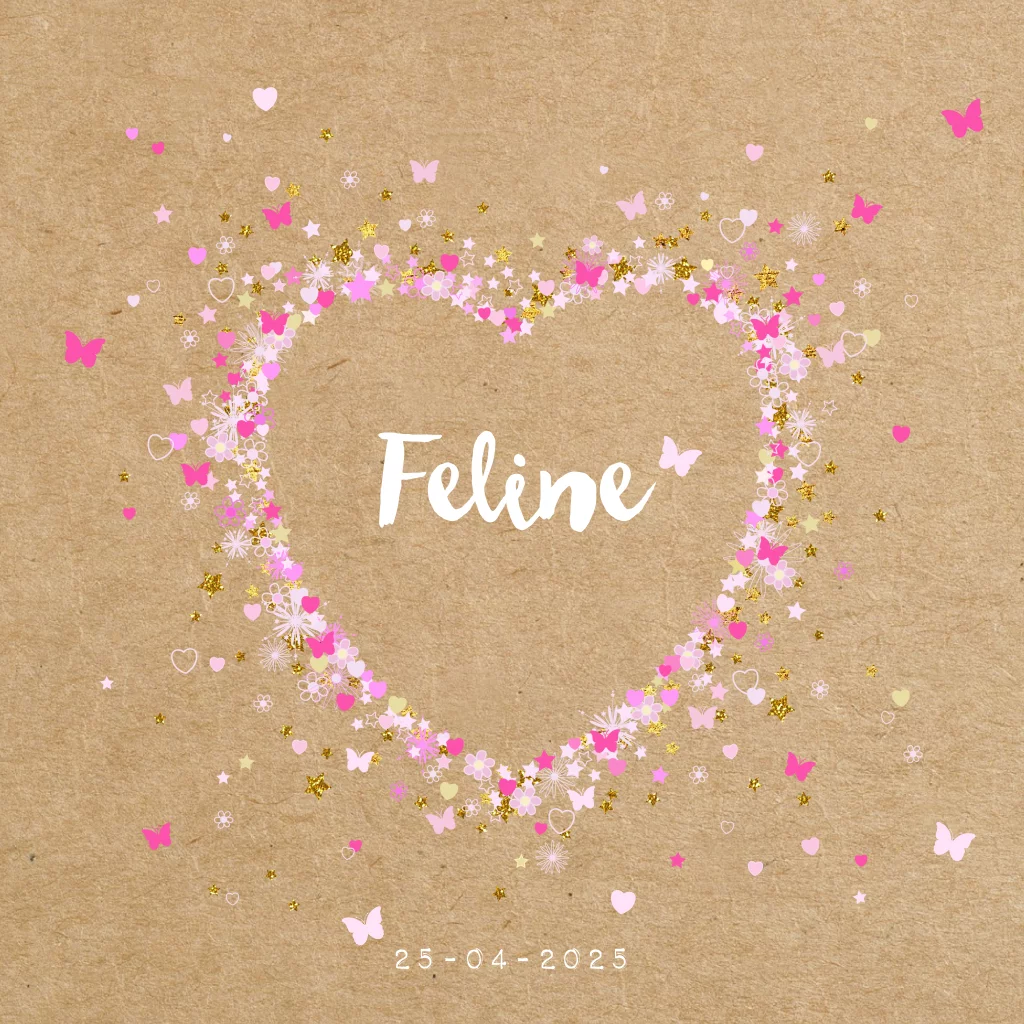 Geboortekaart kraft met hart van bloemen vlinders en hartjes. Feline