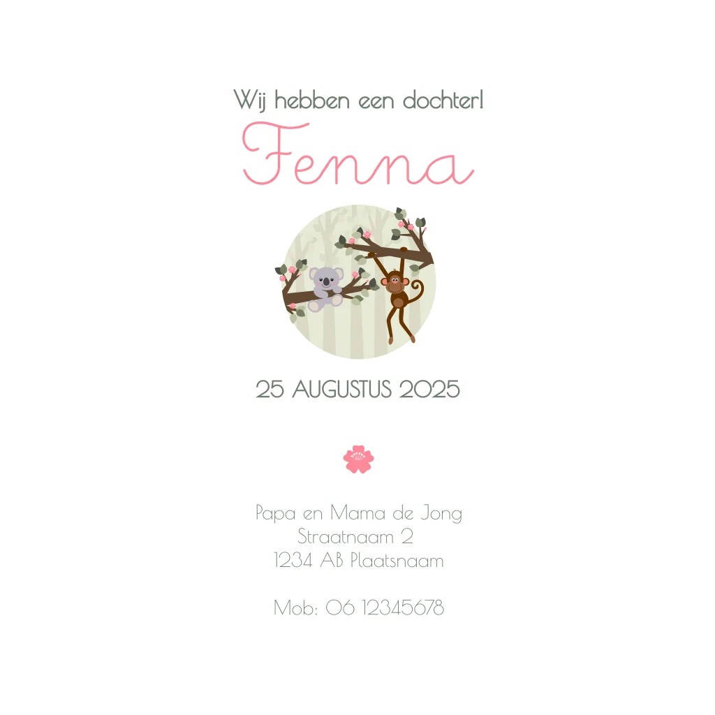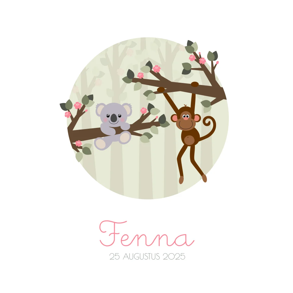 Geboortekaart meisje met aapje en koala in het bos Fenna