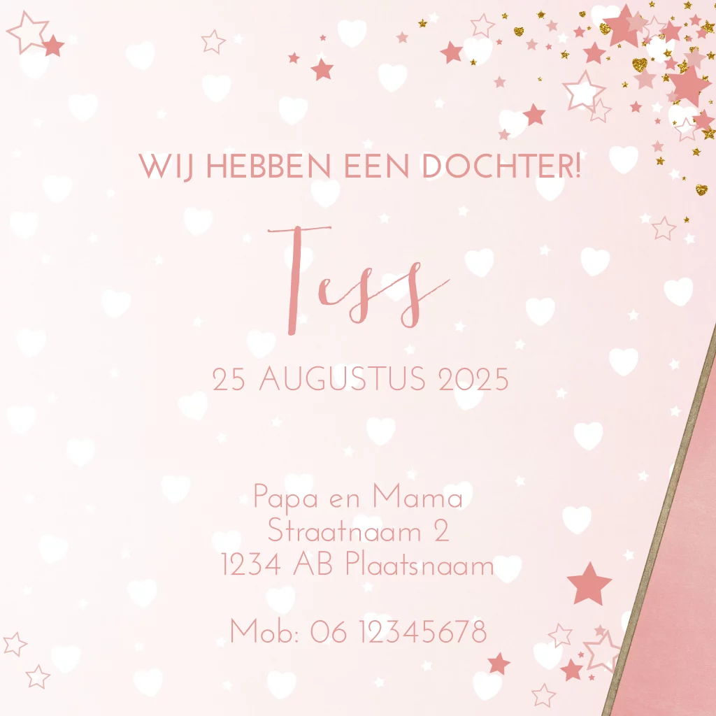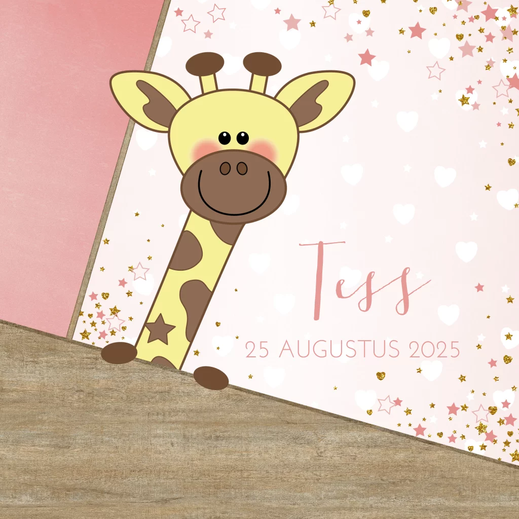 Geboortekaartje meisje met girafje, hartjes en sterren – Zalmroze met houtlook