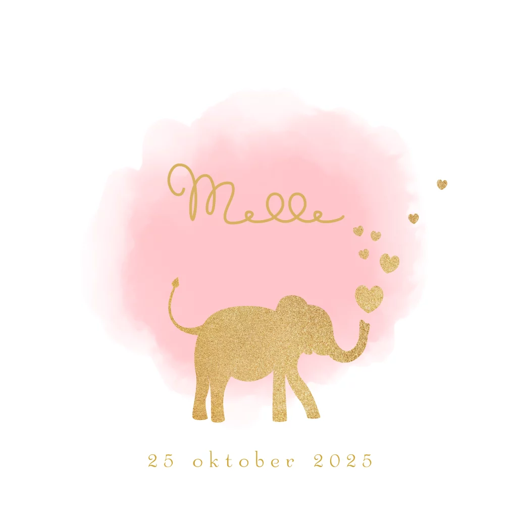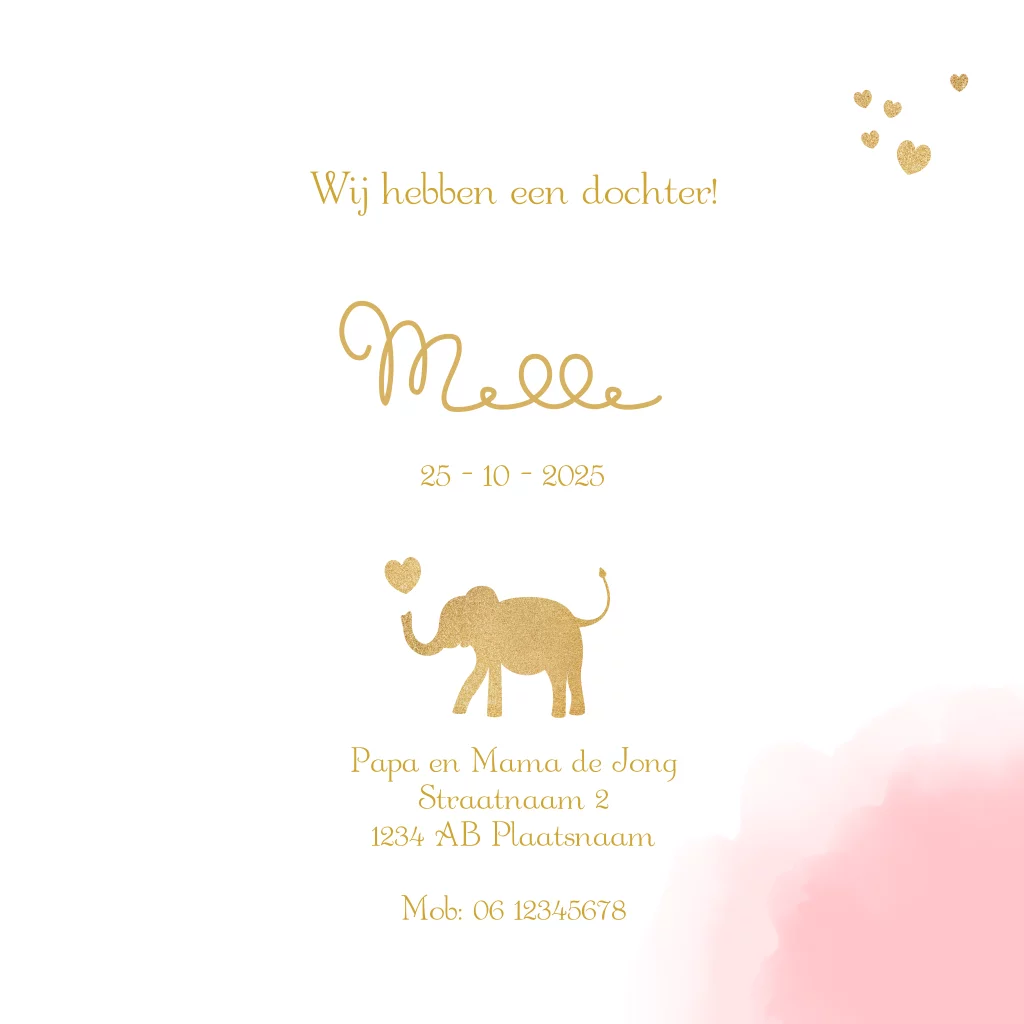 Hip en lief geboortekaartje voor een meisje met een roze waterverf achtergrond en een silhouet van een goudkleurige olifant met hartjes. De kleuren en teksten kunnen naar wens worden aangepast.