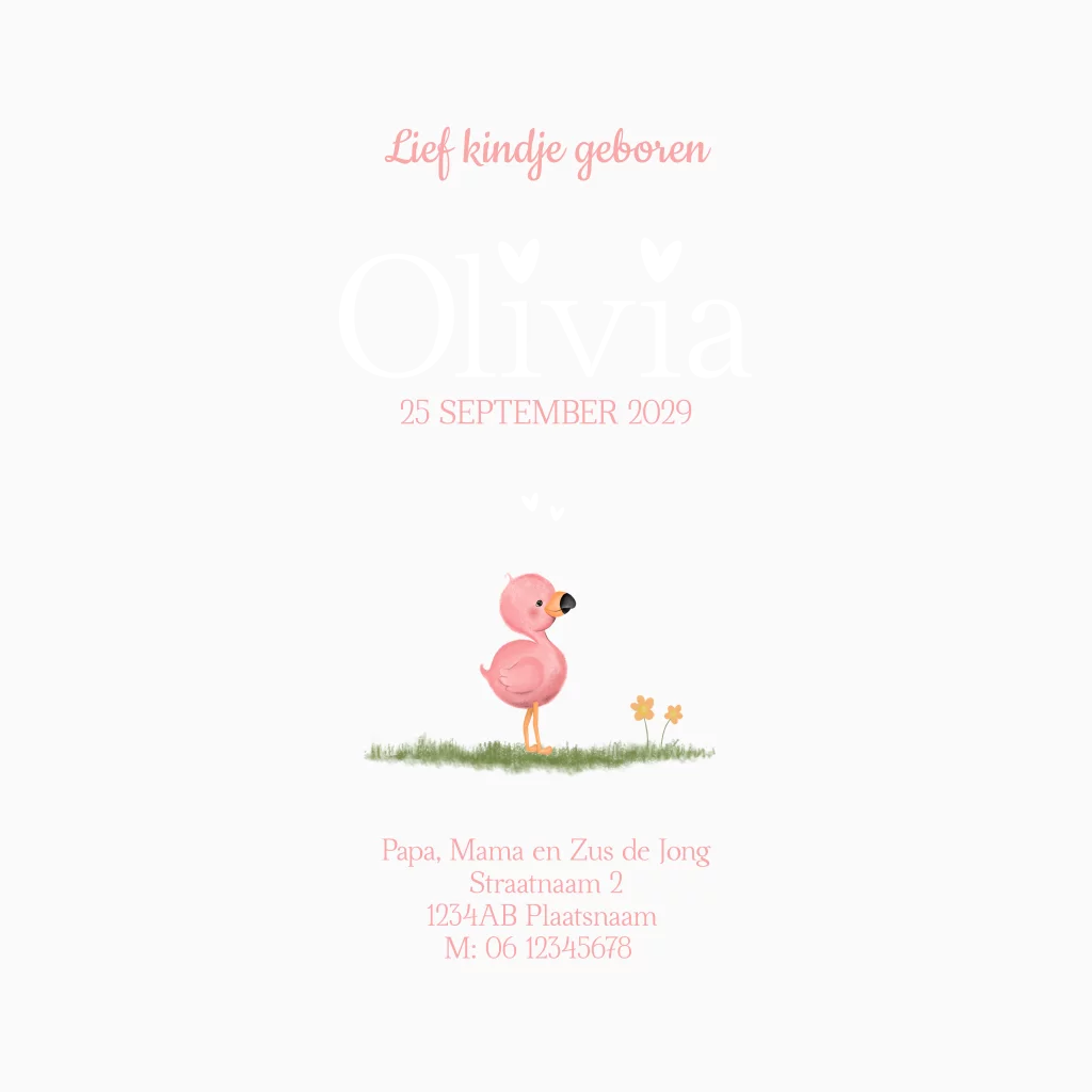 Dit kaartje is onderdeel van de dierenvriendjescollectie, waarin je ook andere kaartjes vindt met vrolijke dieren in dezelfde stijl. Binnenin is ruimte voor een babyfoto, een persoonlijk tekstje én natuurlijk alle geboortegegevens. Het flamingootje komt ook daar subtiel terug, zodat het geheel één vrolijk en stijlvol geheel vormt.