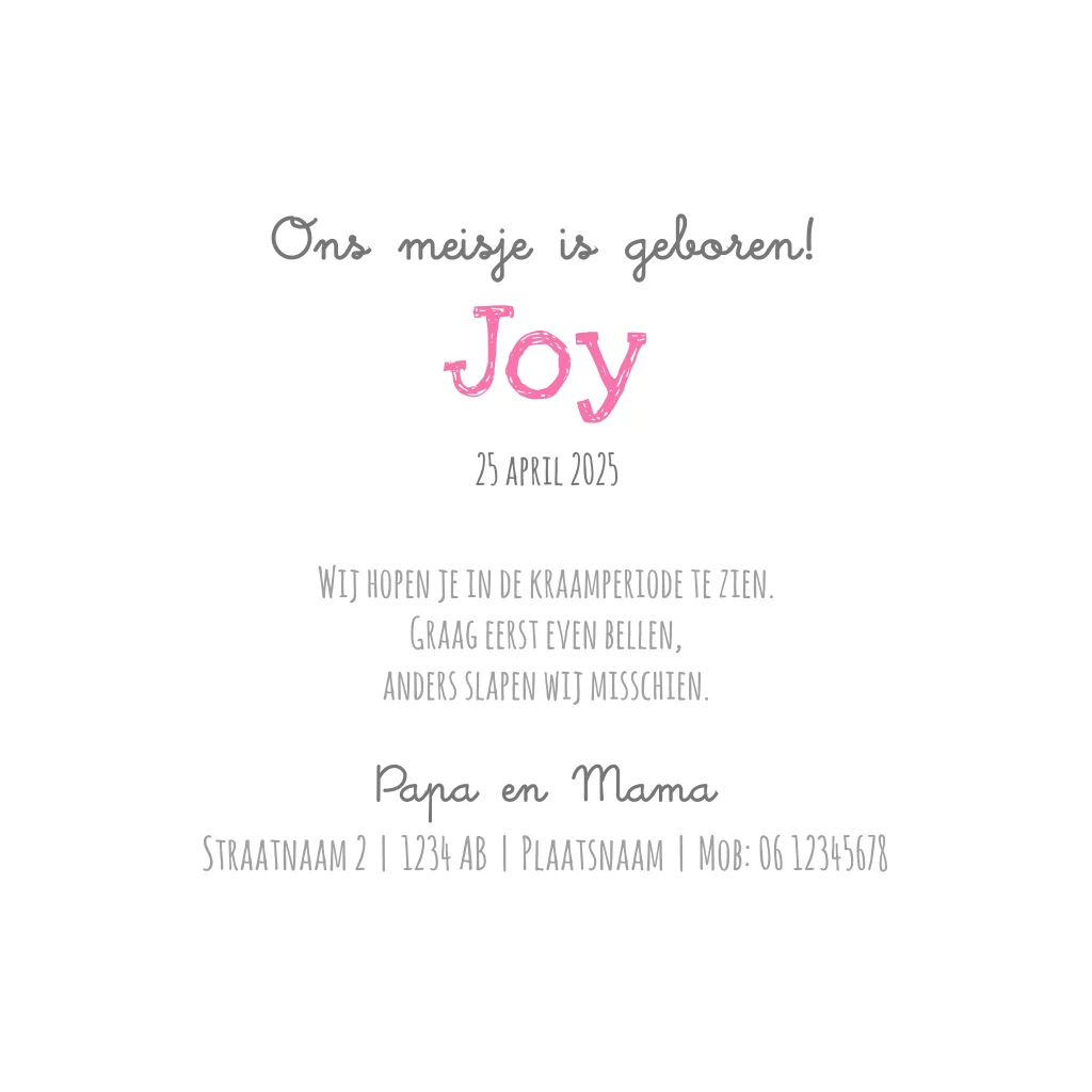 Lief en stoer geboortekaartje met een roze getekend gezichtje met roze wangen. Het leuke van dit kaartje is, dat je zelf de kleur van het gezichtje en de tekst kunt aan passen!