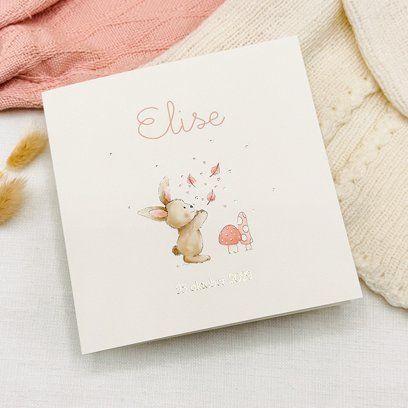Laat iedereen weten dat jullie kindje is geboren met dit lieve geboortekaartje met een zacht getekend konijntje. Het schattige konijn speelt met vallende blaadjes en hartjes in glanzend goudfolie, waardoor het kaartje een luxe en feestelijke uitstraling krijgt.