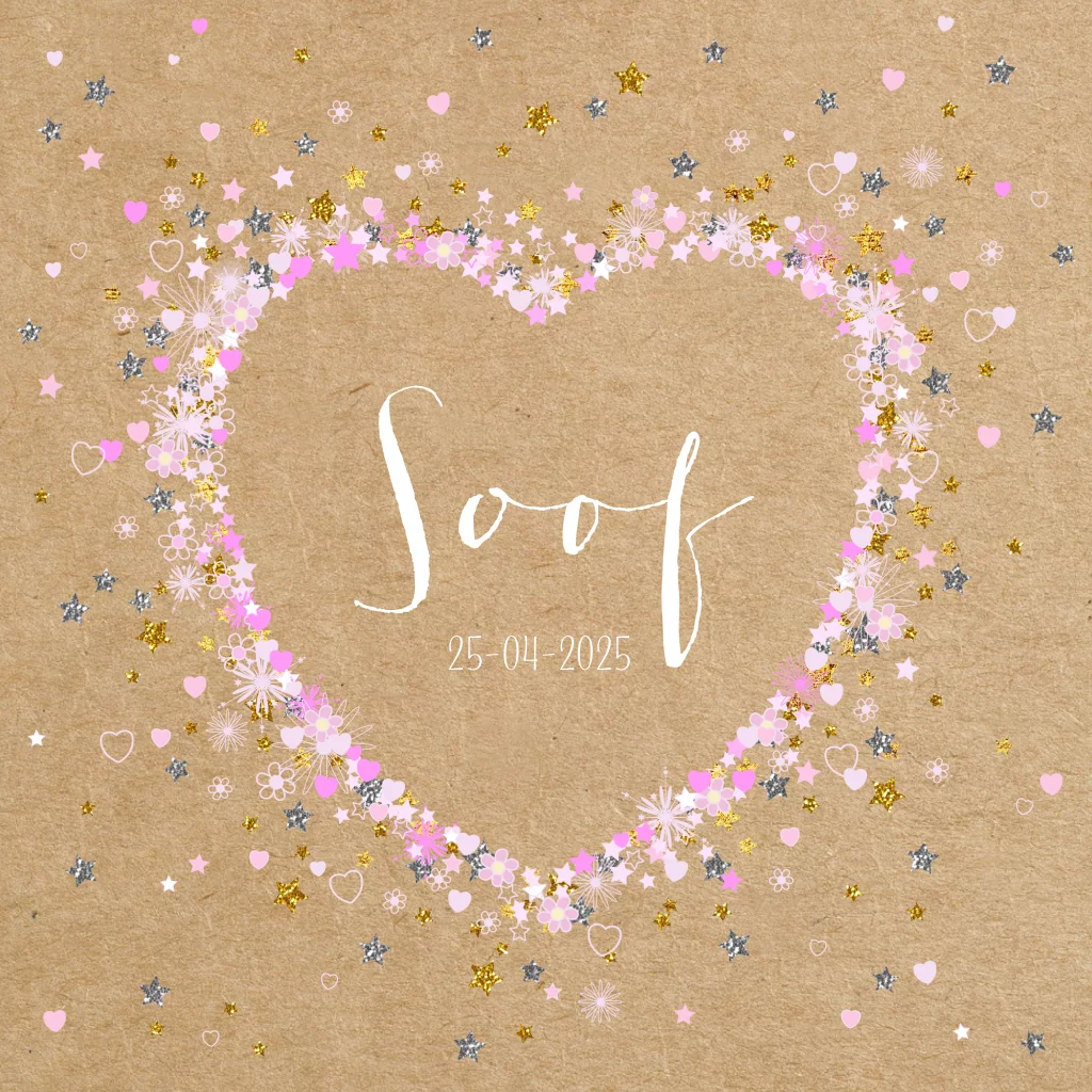 Hip geboortekaartje voor een meisje met een hart van hartjes, sterren en bloemen op een kraftlook achtergrond. Pas de geboortekaart naar wens aan en maak er zo jullie unieke geboortekaartje van.