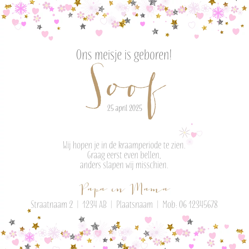 Geboortekaartje meisje kraft met hartjes sterren en bloemen