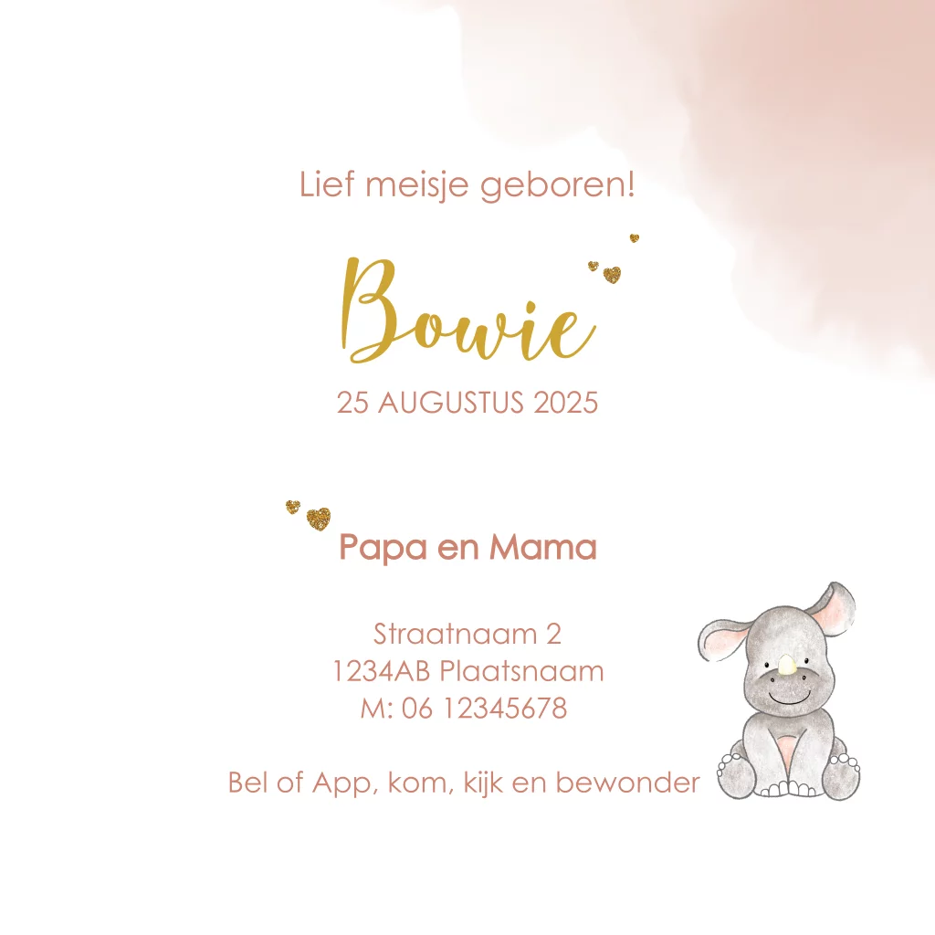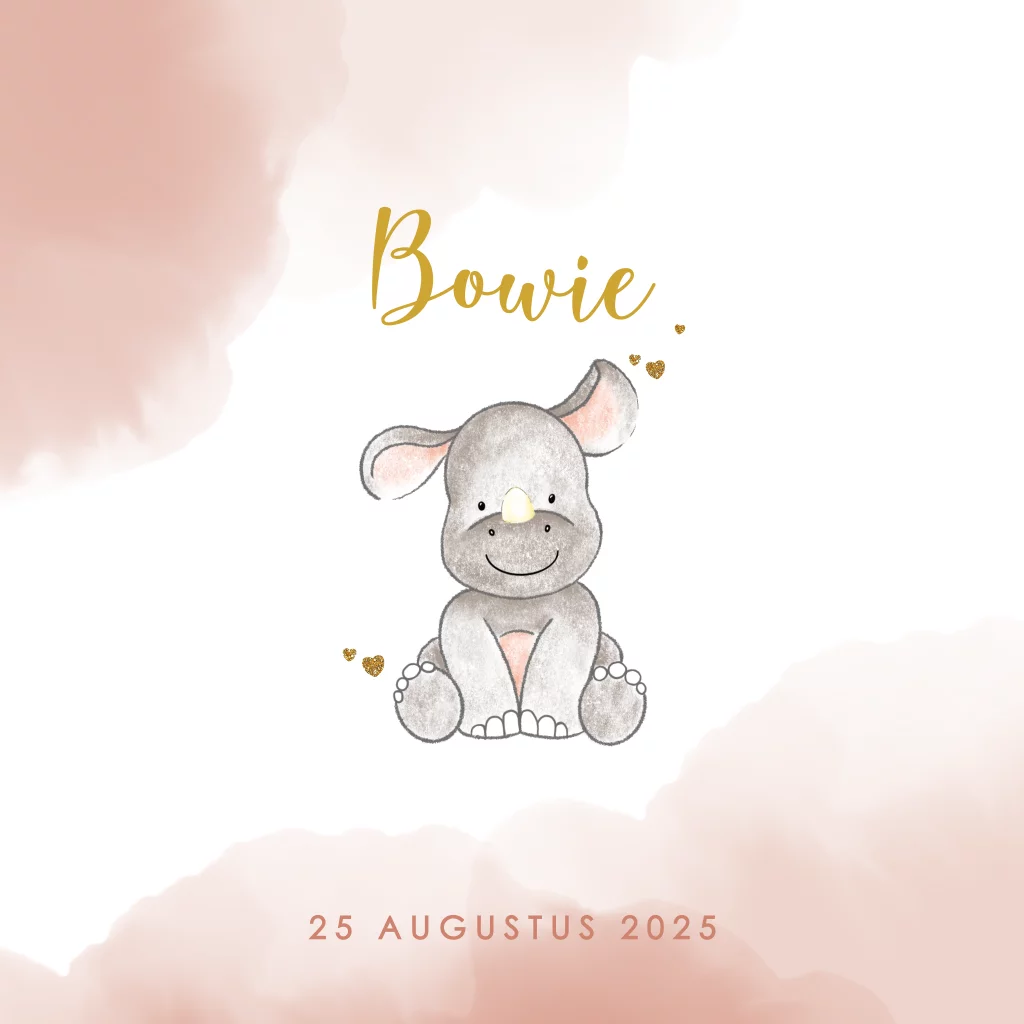 Zo lief, dit geboortekaartje voor een meisje. De achtergrond heeft een witte kleur met terra gekleurde waterverf. De tekening van deze schattige baby neushoorn heeft een lieve look. Pas dit schattige geboortekaartje naar wens aan en bestel eerst een proefdruk om te zien hoe het kaartje voor jullie kindje er in het echt uitkomt te zien.