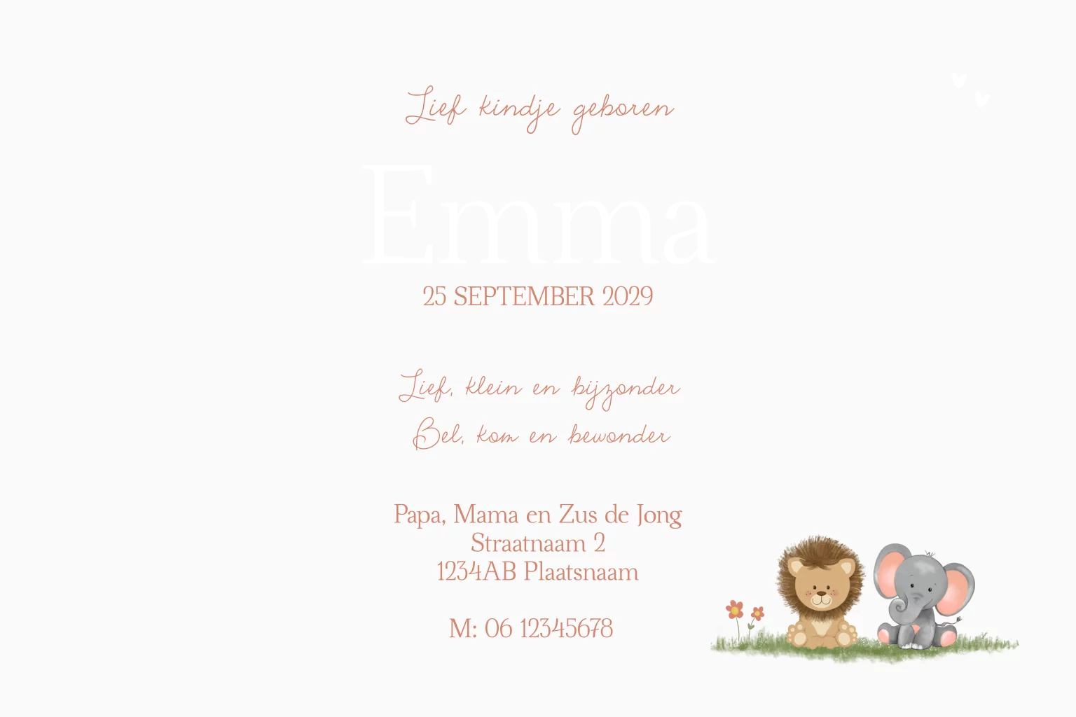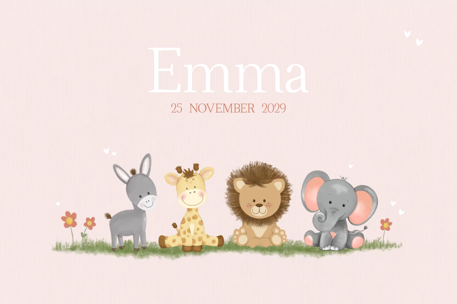 Kondig de geboorte van jullie dochter aan met dit lieve geboortekaartje vol vrolijke dierenvriendjes. Op de zachte roze achtergrond staan een ezeltje, girafje, leeuwtje en olifantje gezellig op een rij — samen vormen ze een hartverwarmend welkom voor jullie kleintje.