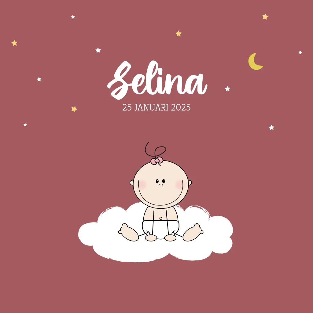 Geboortekaartje voor een meisje. Grappig, roze/ plum-kleurig geboortekaartje met een illustratie van een schattige baby op een wolkje tussen de sterretjes een een maantje. Je kunt deze geboortekaart eenvoudig naar wens aanpassen en er jullie unieke geboortekaart van maken.