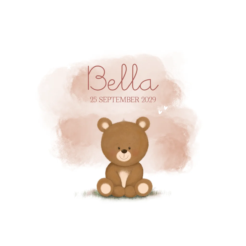 Welkom lief kindje! Dit lieve geboortekaartje met schattig beertje, zachte aquarel wolk en kleine hartjes is perfect voor een meisje.