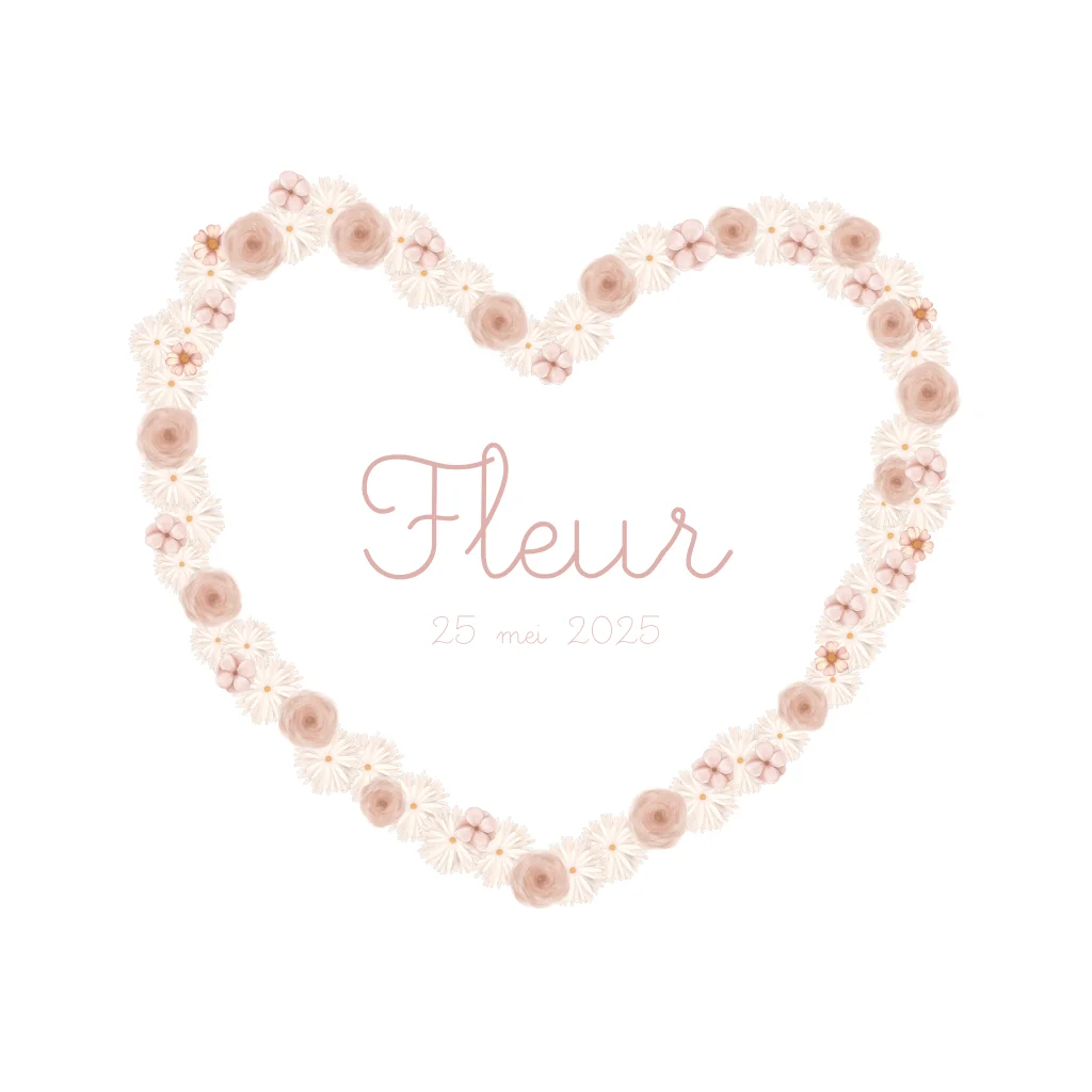 Een lief geboortekaartje met bloemetjeshart in roze tinten. Personaliseer eenvoudig in onze online editor.