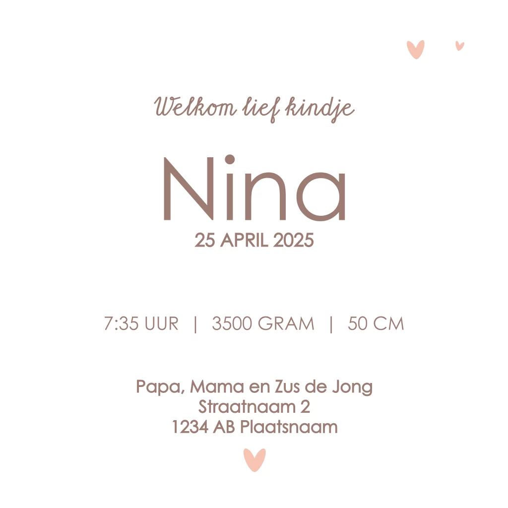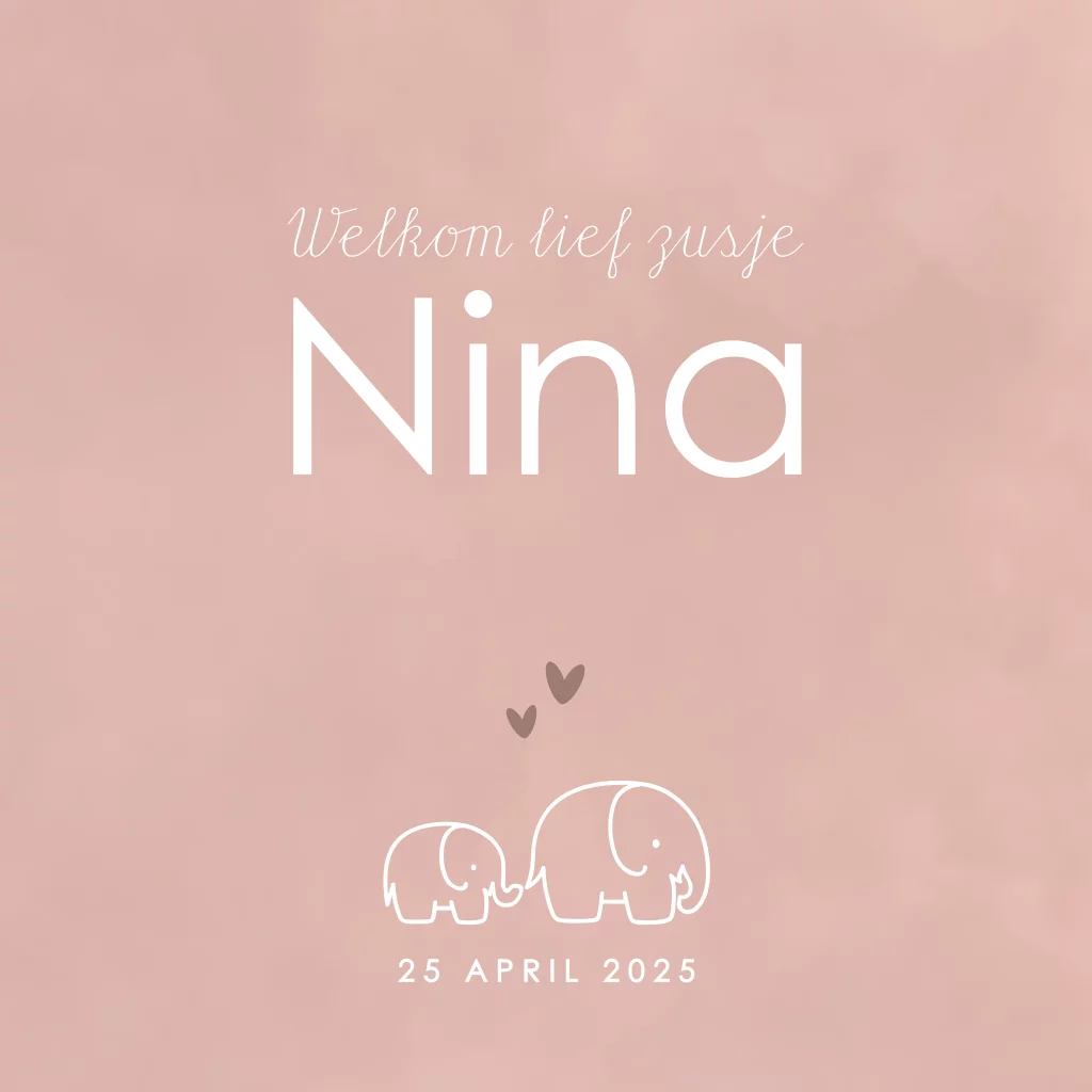 Schattig geboortekaartje voor een zusje. Dit roze geboortekaartje heeft een velvet uitstraling en een minimalistisch ontwerp van 2 kleine olifantjes met hartjes. Deze geboortekaart is erg leuk voor een tweede kindje. Wil je deze kaart graag voor een derde kindje? In de afbeeldingen vind je bij de "FOLIE DIEREN" een afbeelding met 3 olifantjes. Wil je dat wij je helpen? Neem gerust even contact met ons op. Dan passen wij deze kaart graag voor je aan.