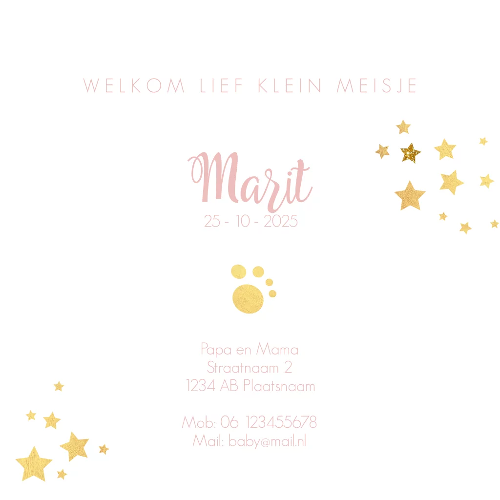 Lief roze geboorte kaartje met een illustratie van een super schattig beetje met goud kleurige sterren.