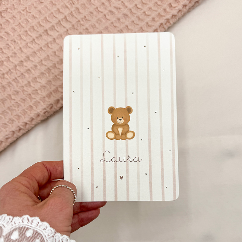 Dit lieve geboortekaartje met zachte strepen en een schattige teddybeer heeft een warme en rustige uitstraling. De kleine hartjes in rosegoudfolie geven het ontwerp een extra luxe en stijlvolle afwerking. De naam, tekst en kleuren zijn volledig aanpasbaar in de editor, zodat je het kaartje helemaal eigen kunt maken. Wil je dit ontwerp liever in een ander formaat of op een bijpassend product? Stuur me gerust een berichtje, dan zet ik het gratis voor je klaar.