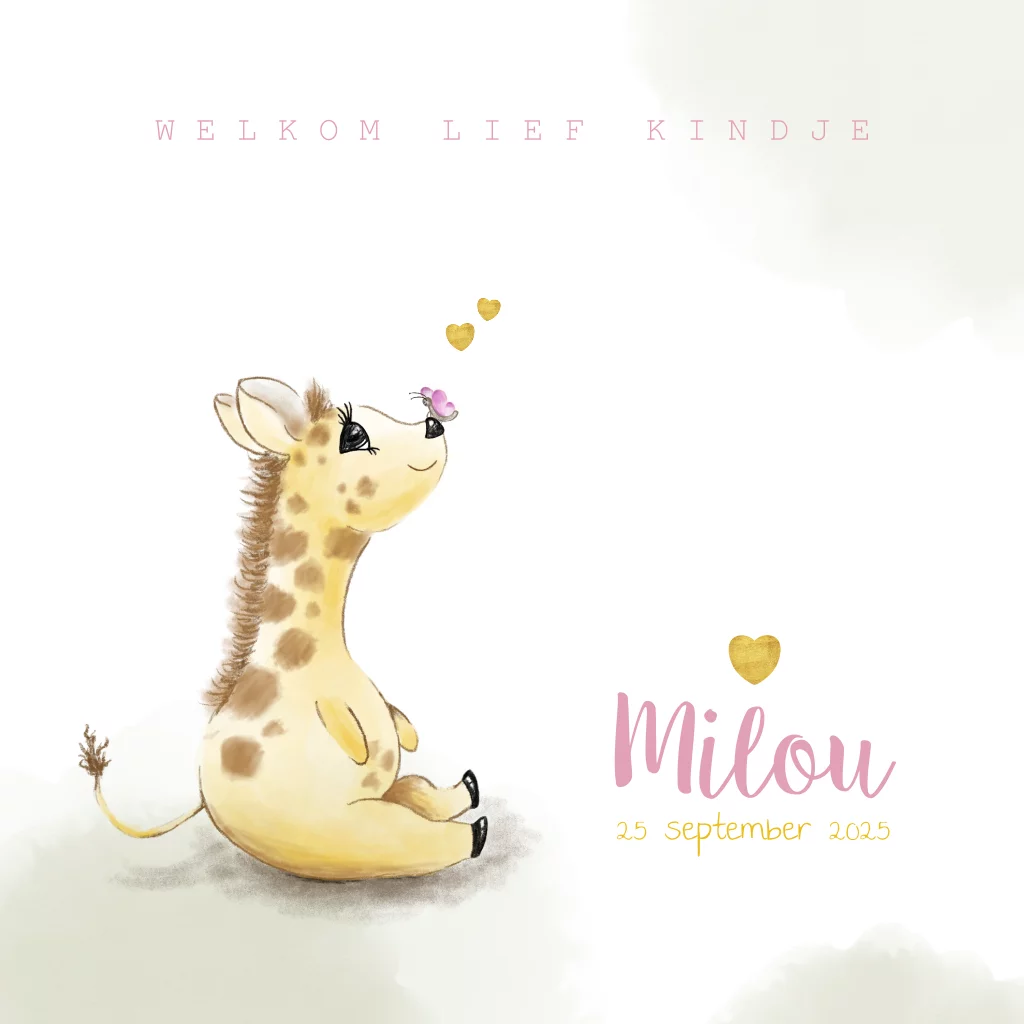 Geboortekaartje tekening lief girafje met vlinder Milou