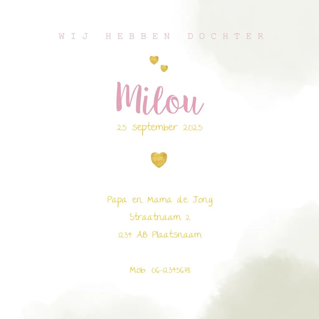 Schattige, hip geboortekaartje voor een meisje met waterverf, hartjes en een tekening van een lief baby girafje met een vlindertje op zijn neus.