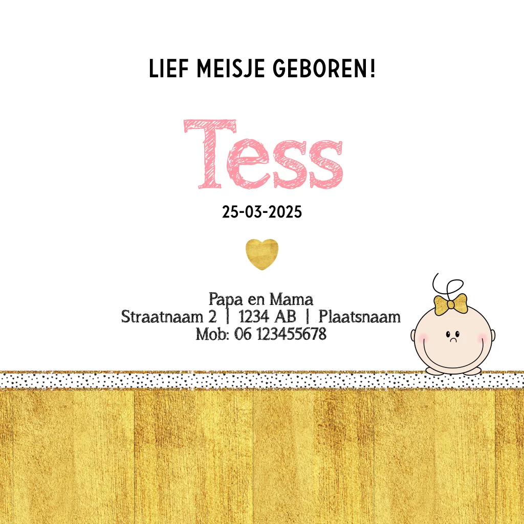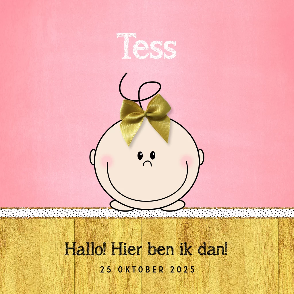 Schattig roze geboortekaartje voor een meisje met een illustratie van een baby dat over een goudkleurige rand kijkt. De baby heeft een echt satijnen strikje in haar babykrul. LET OP: Bij deze kaart wordt het satijnen strikje niet gedrukt, maar is als voorbeeld waar je een echt strikje kunt plakken. De echte strikjes kunnen in het besteloverzicht van de kaart worden besteld. Ook is het mogelijk om een andere kleur te kiezen.