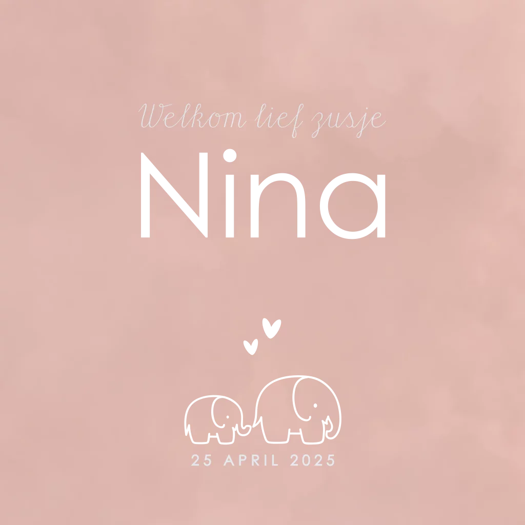 Hip geboortekaartje meisje zusje met olifantjes en rosegoudfolie