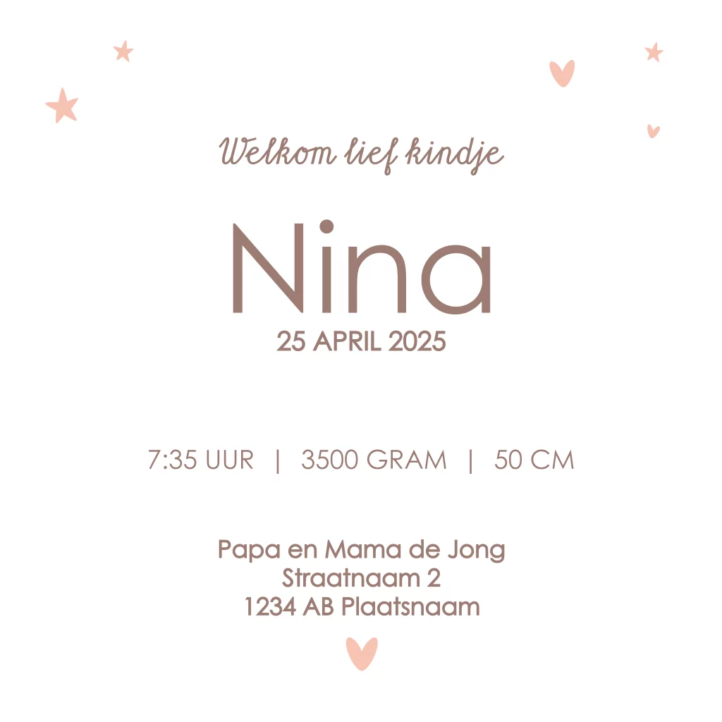 Hip en stijlvol geboortekaartje voor een meisje. Deze hippe geboortekaart voor jullie tweede kindje heeft een roze velvet-look en ter illustratie 2 kleine olifantjes met hartjes gedrukt met rosé goudfolie. Pas het geboortekaartje naar wens aan en kies eventueel een andere folie kleur. Vraag gerust eerst een proefdruk aan, zodat je het kaartje in het echt kunt bekijken.