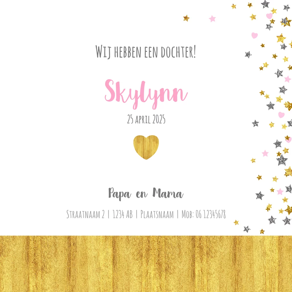Hippe geboortekaart gouden hart met sterren Skylynn