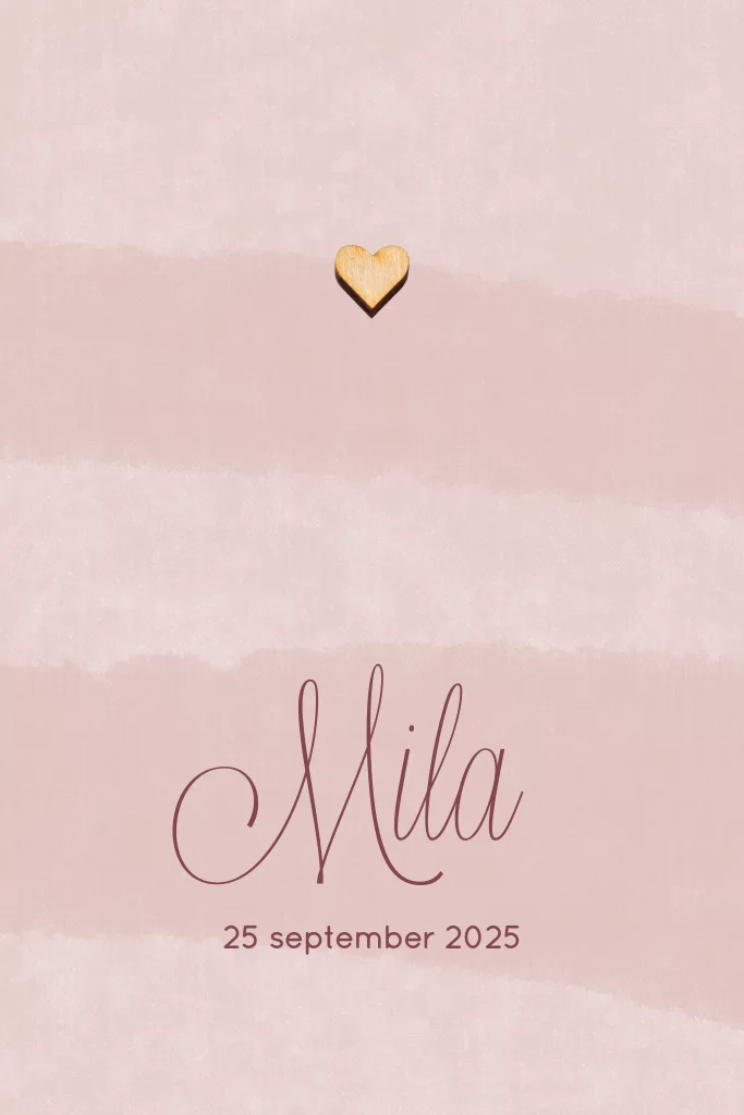 Dit lieve, roze geboortekaartje heeft een minimalistisch ontwerp. De ronde hoeken en het echte houten hartje maken deze kaart extra bijzonder.