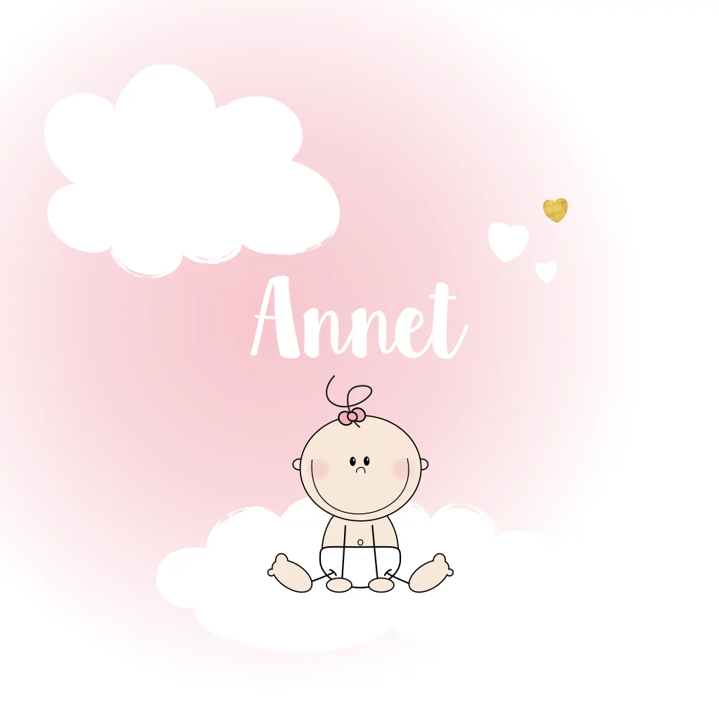 Lief roze geboortekaartje meisje illustratie kindje met wolken Annet