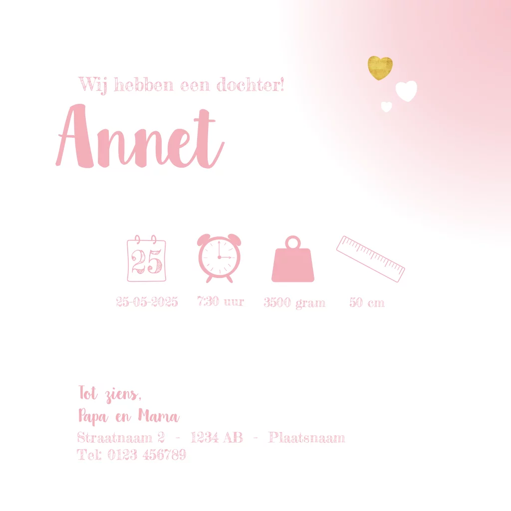 Lief roze geboortekaartje met wolken, hartjes en een illustratie van een schattig baby meisje op een wolkje.