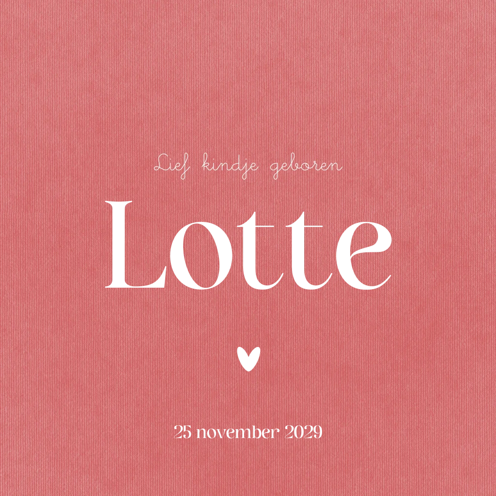 Een stijlvol en liefdevol geboortekaartje voor een meisje. De diepe roze achtergrond met subtiele linnenstructuur straalt warmte en elegantie uit. De naam en datum worden in goudfolie gedrukt, waardoor het kaartje een luxe uitstraling krijgt. Het kleine hartje en de zachte typografie maken het ontwerp helemaal af.