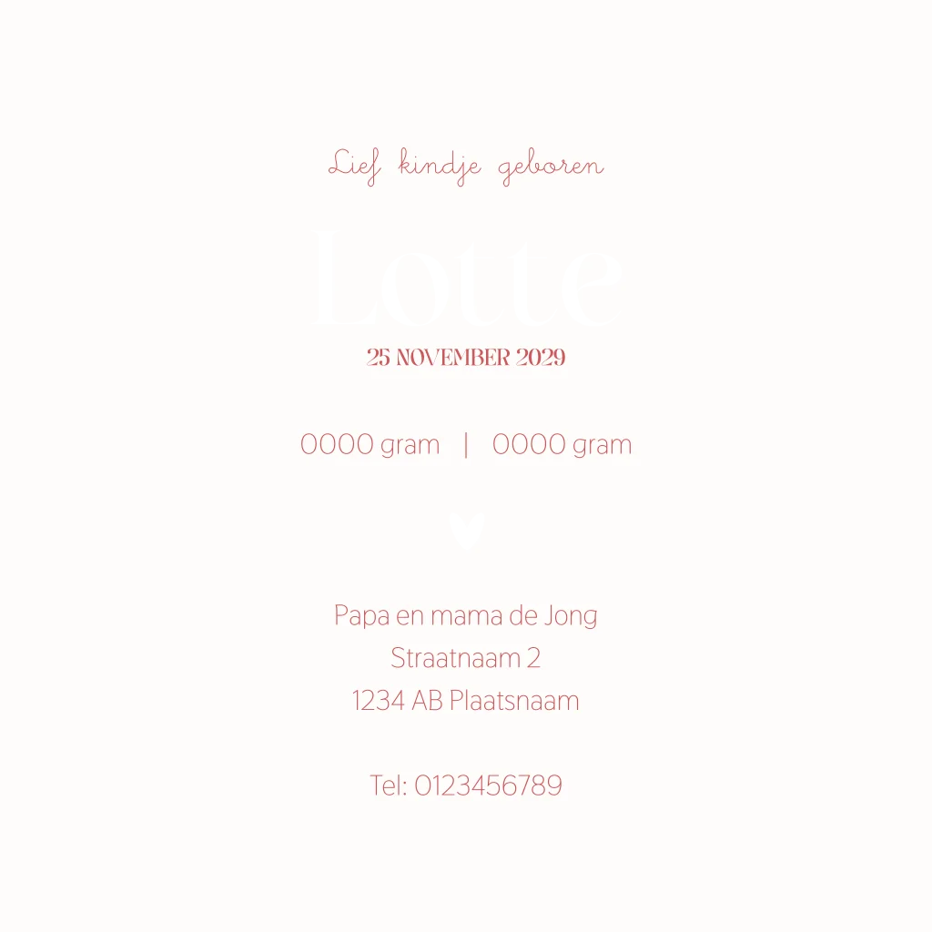 Binnenin is er ruimte voor een mooie babyfoto en persoonlijke tekst, zodat dit kaartje écht een uniek aandenken wordt. Perfect voor ouders die houden van een moderne, chique uitstraling met een vleugje romantiek.