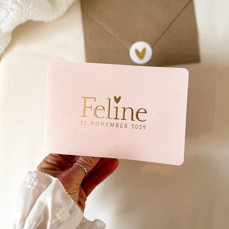 Minimalistisch geboortekaartje roze met hartje en goudfolie – Feline