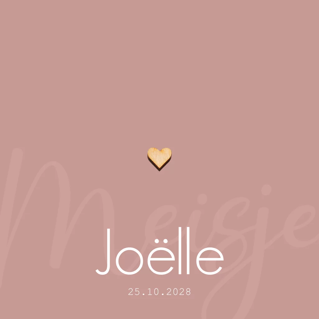 Verwelkom jouw kleintje in stijl met ons prachtige oud roze geboortekaartje voor een meisje, voorzien van een minimalistisch design en een echt houten hartje. Dit charmante kaartje is volledig aanpasbaar naar jouw wensen en biedt de mogelijkheid om een proefdruk te bestellen.