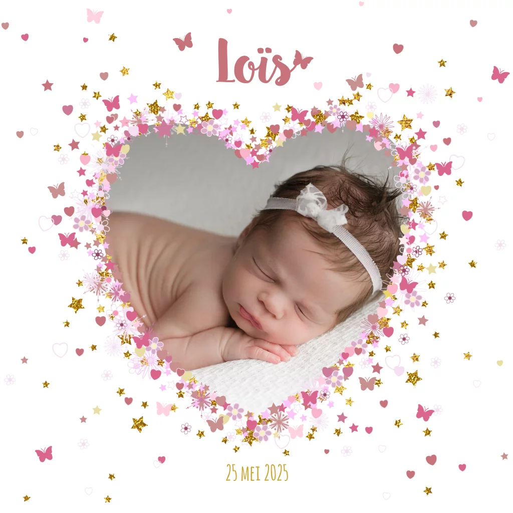 Geboortekaart foto in een hart van hartjes, bloemen en vlinders