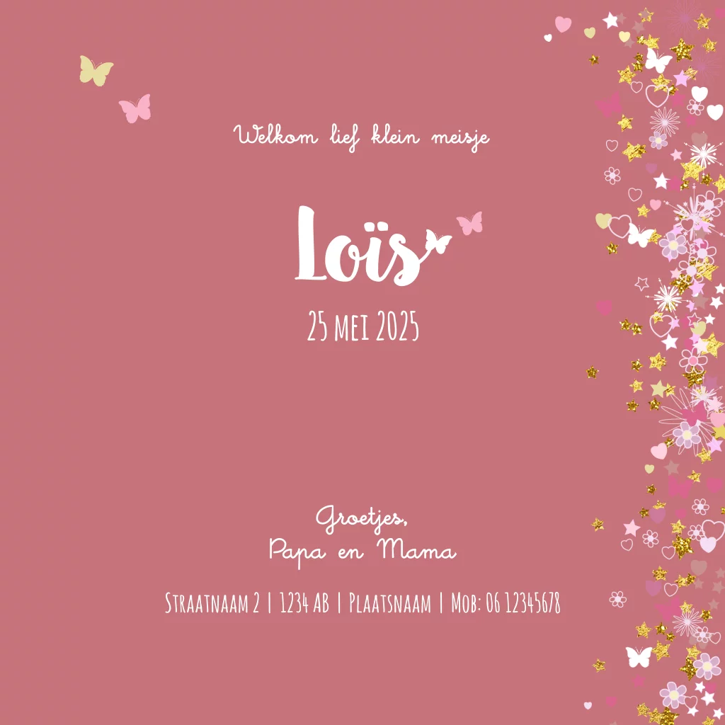 Schattige geboortekaart met een foto van jullie kindje. Deze geboortekaart heeft een groot hart van hartjes, sterren, bloemen en vlinders. Plaats de foto van jullie kindje op dit geboortekaartje en pas de teksten aan.