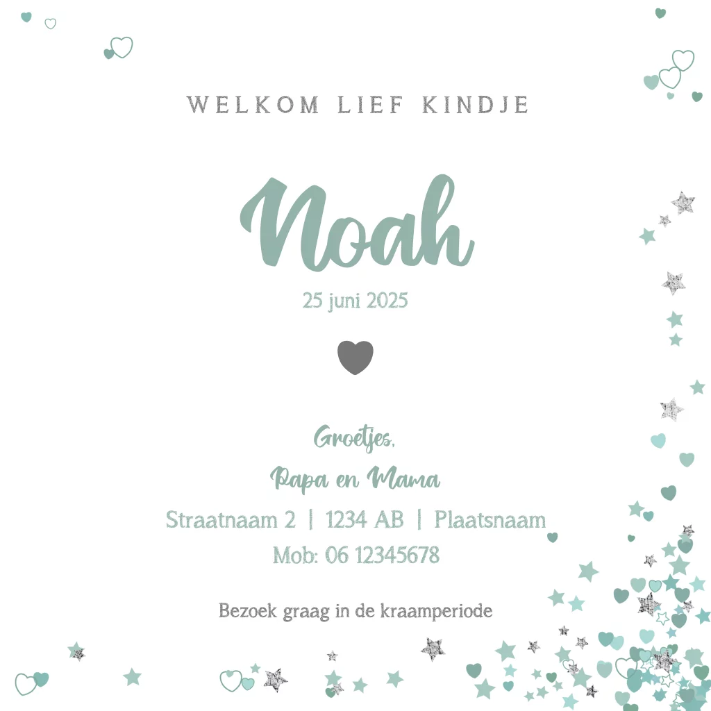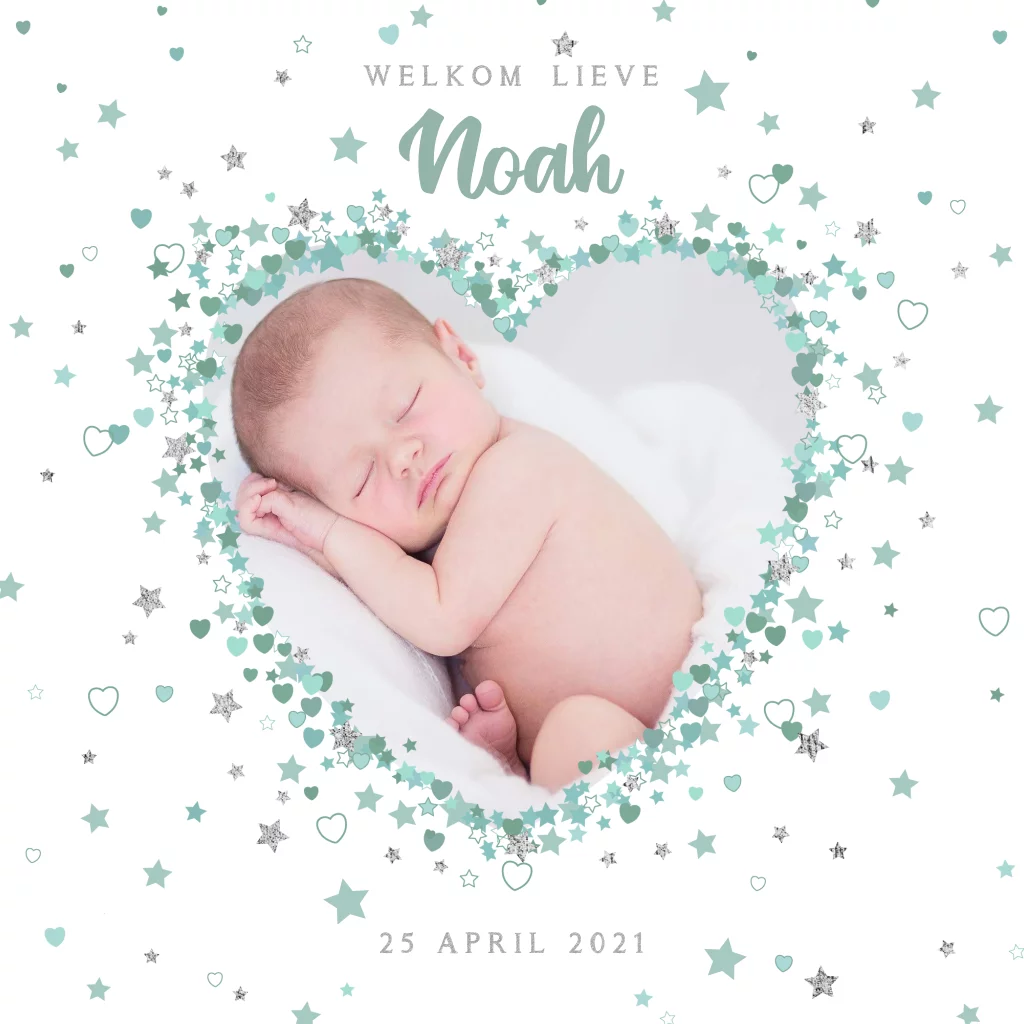 Schattige geboortekaart met een foto van jullie kindje. Deze geboortekaart heeft een groot hart van hartjes en sterretjes in mintgroen en ash-green tinten. Plaats de foto van jullie kindje op dit geboortekaartje en pas de teksten naar wens aan.