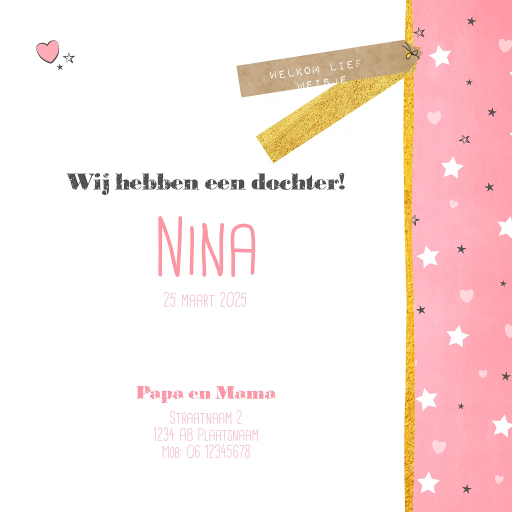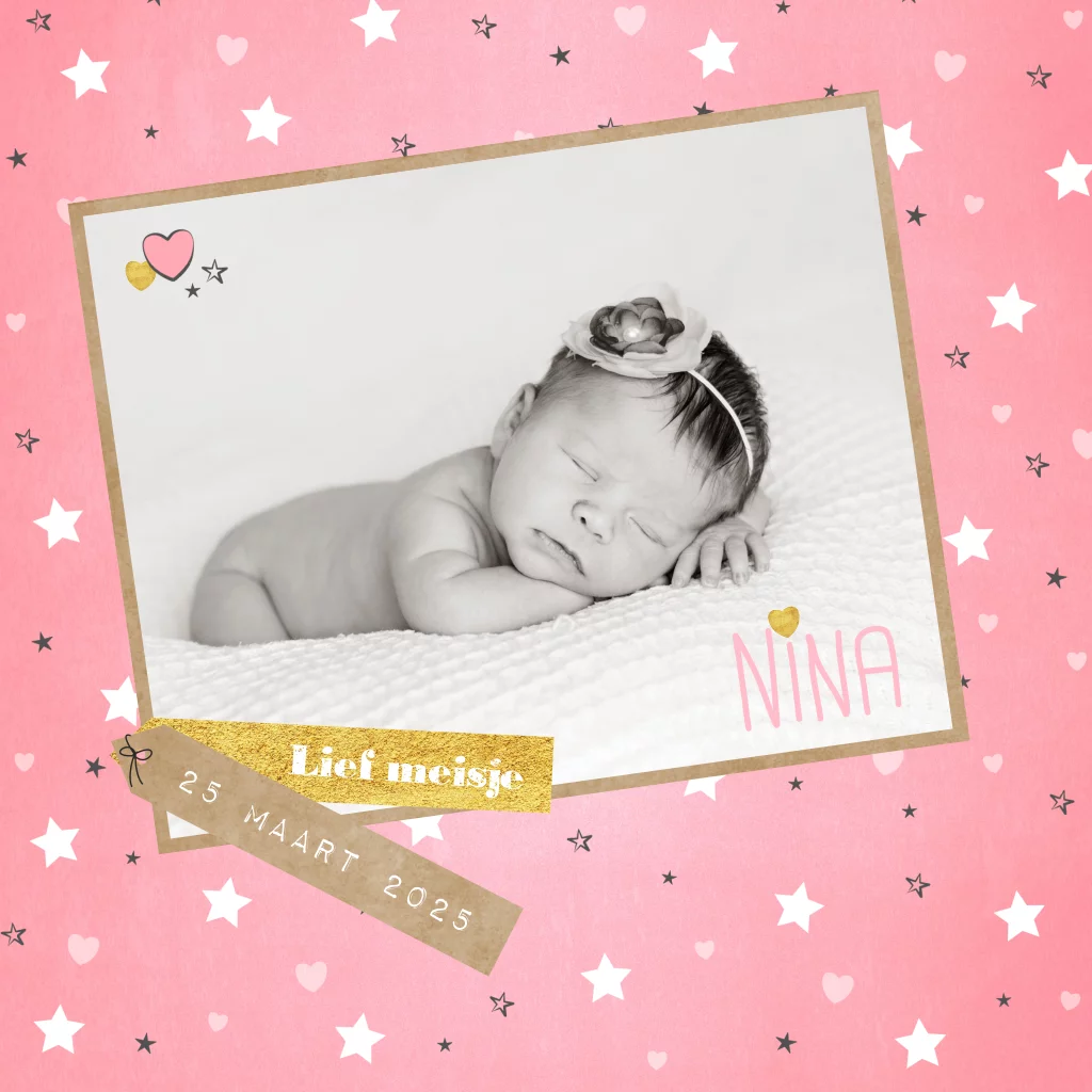 Geboortekaart met foto lief roze kaartje sterren en hartjes Nina