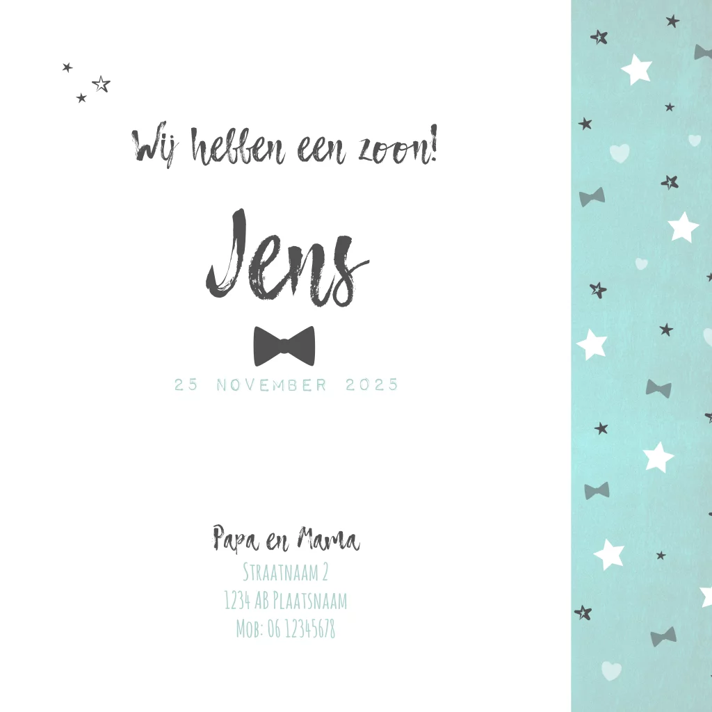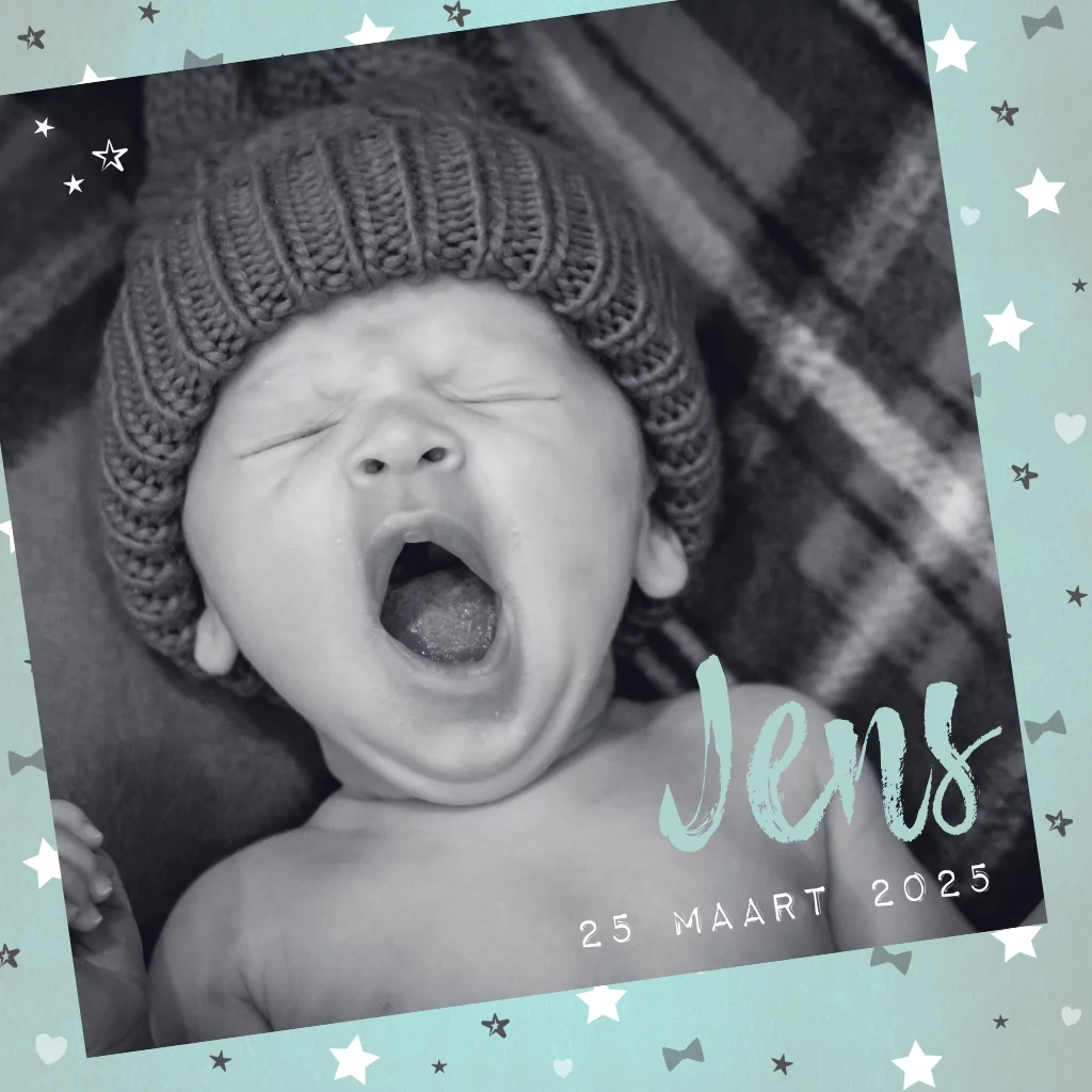 Geboortekaart met foto stoer en hip met sterren en strikjes Jens